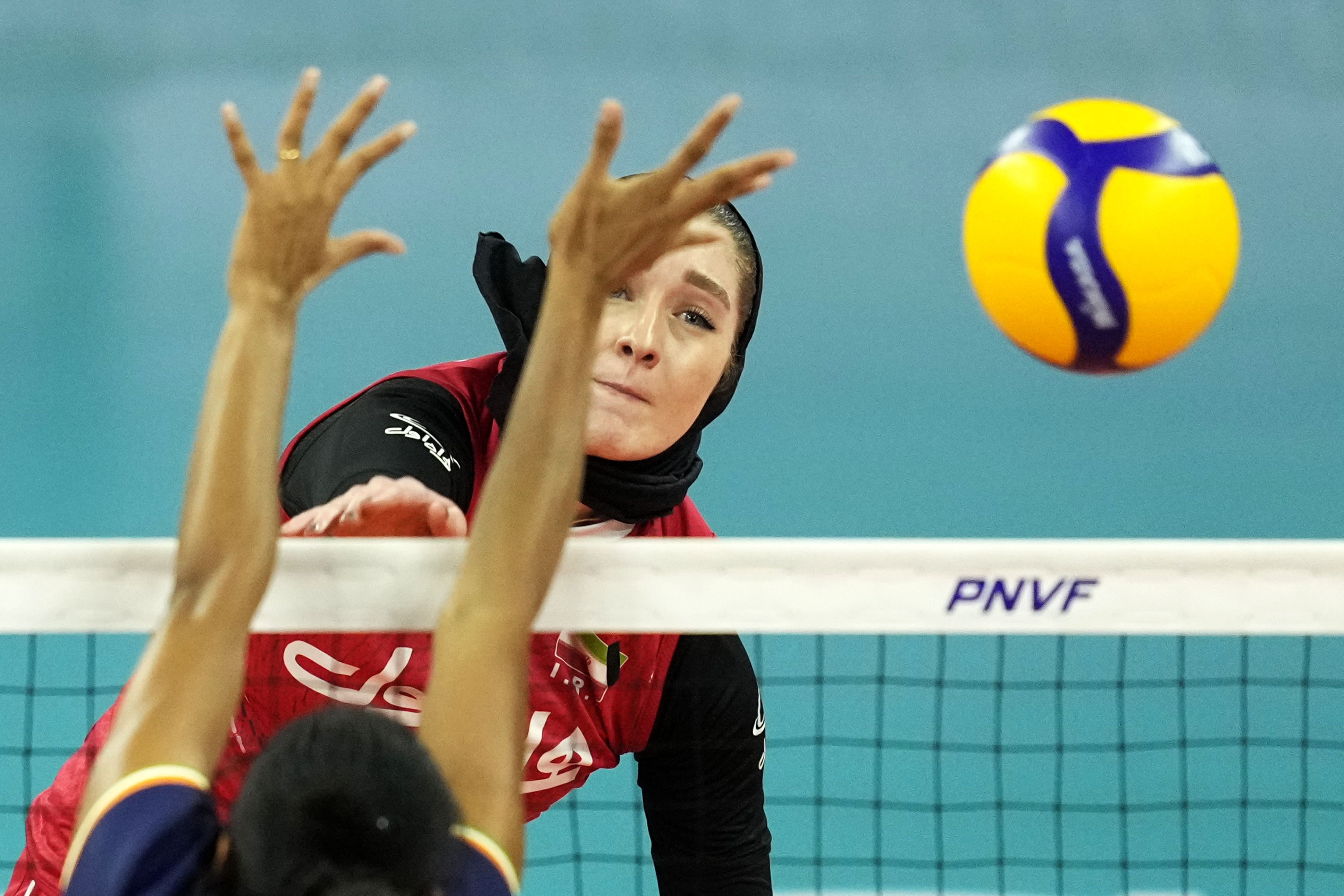 Iran's Aytak Salamatgharamaleki hits the ball against India's team during the Asian Women's Volleyball Challenge Cup in Manila, Philippines on Wednesday, May 22, 2024. (Photo by Aaron Favila/AP Photo)