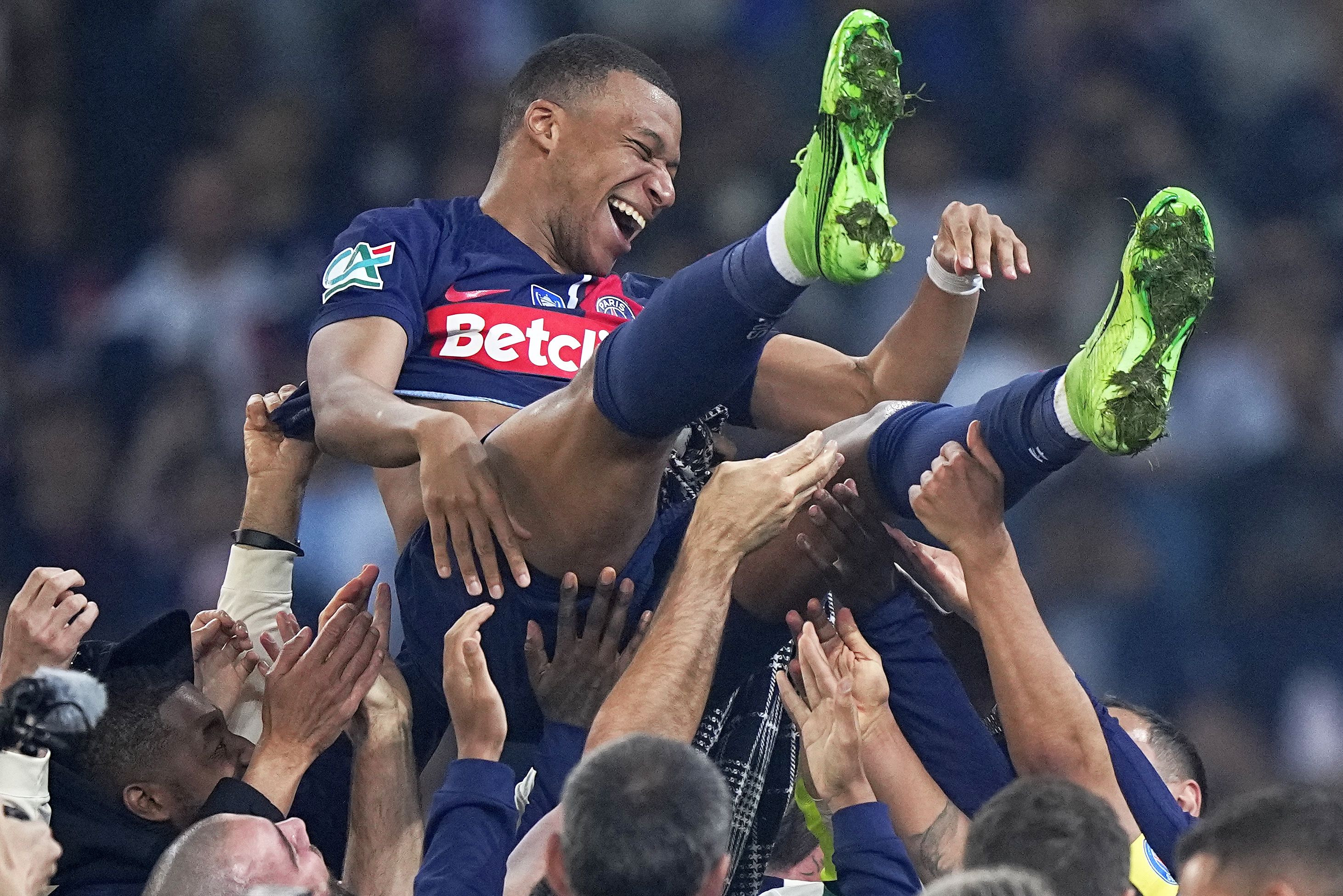 PSG's Kylian Mbappe is tossed into the air as he celebrates with teammates after the French Cup final soccer match between Lyon and PSG at the Pierre Mauroy stadium in Villeneuve d'Ascq, northern France, Saturday, May 25, 2024. PSG won the match 2-1. (Photo by Michel Euler/AP Photo)