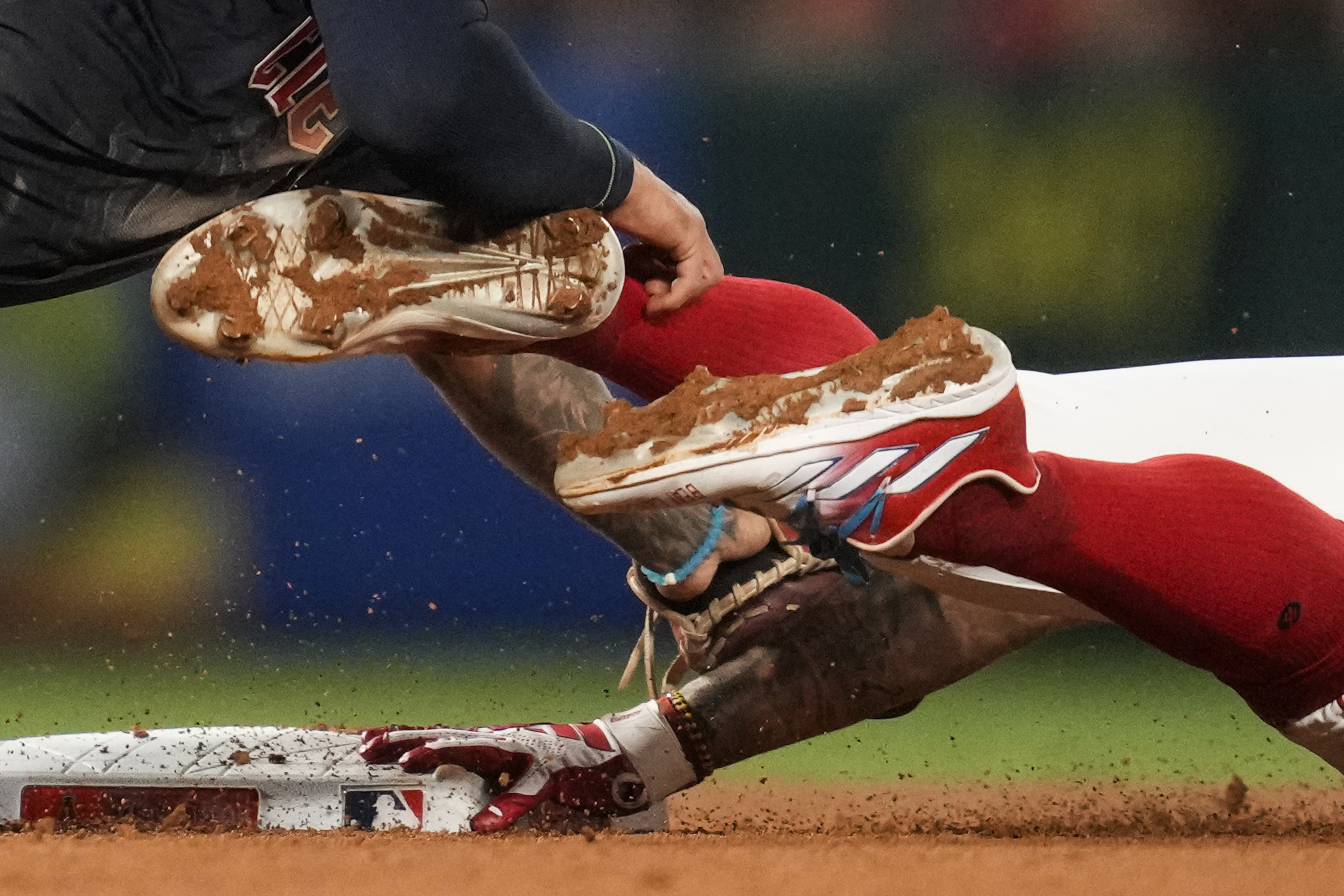 Los Angeles Angels' Zach Neto, right, is caught stealing second by Cleveland Guardians shortstop Brayan Rocchio, left, during the seventh inning of a baseball game in Anaheim, Calif., Saturday, May 25, 2024. (Photo by Ashley Landis/AP Photo)