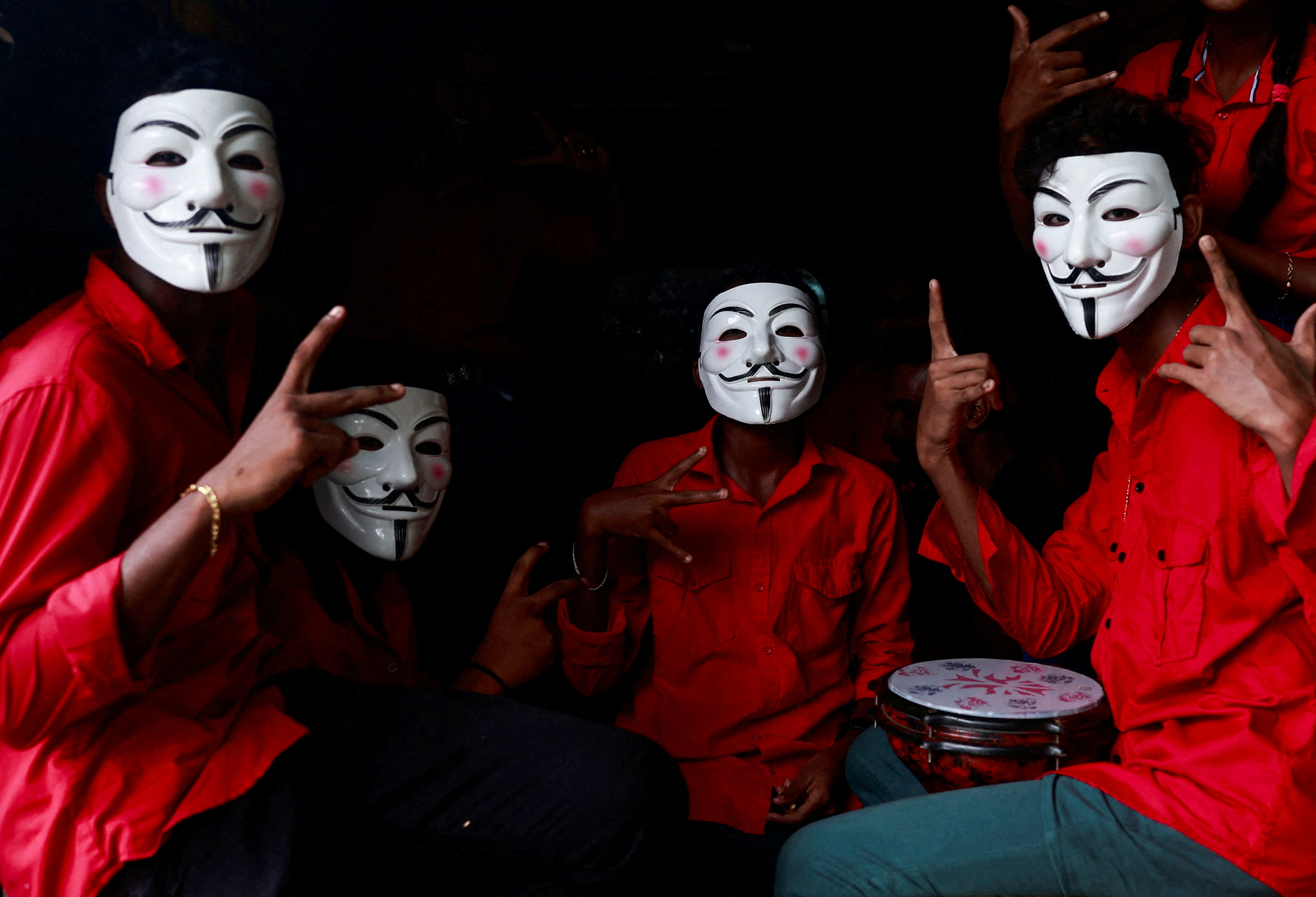 A group of young people wear masks as they prepare to visit Vesak zones in the capital tonight on Vesak Day, an annual celebration of Buddha's birth, enlightenment and death at the Kelaniya temple in Colombo, Sri Lanka on May 23, 2024. (Photo by Dinuka Liyanawatte/Reuters)