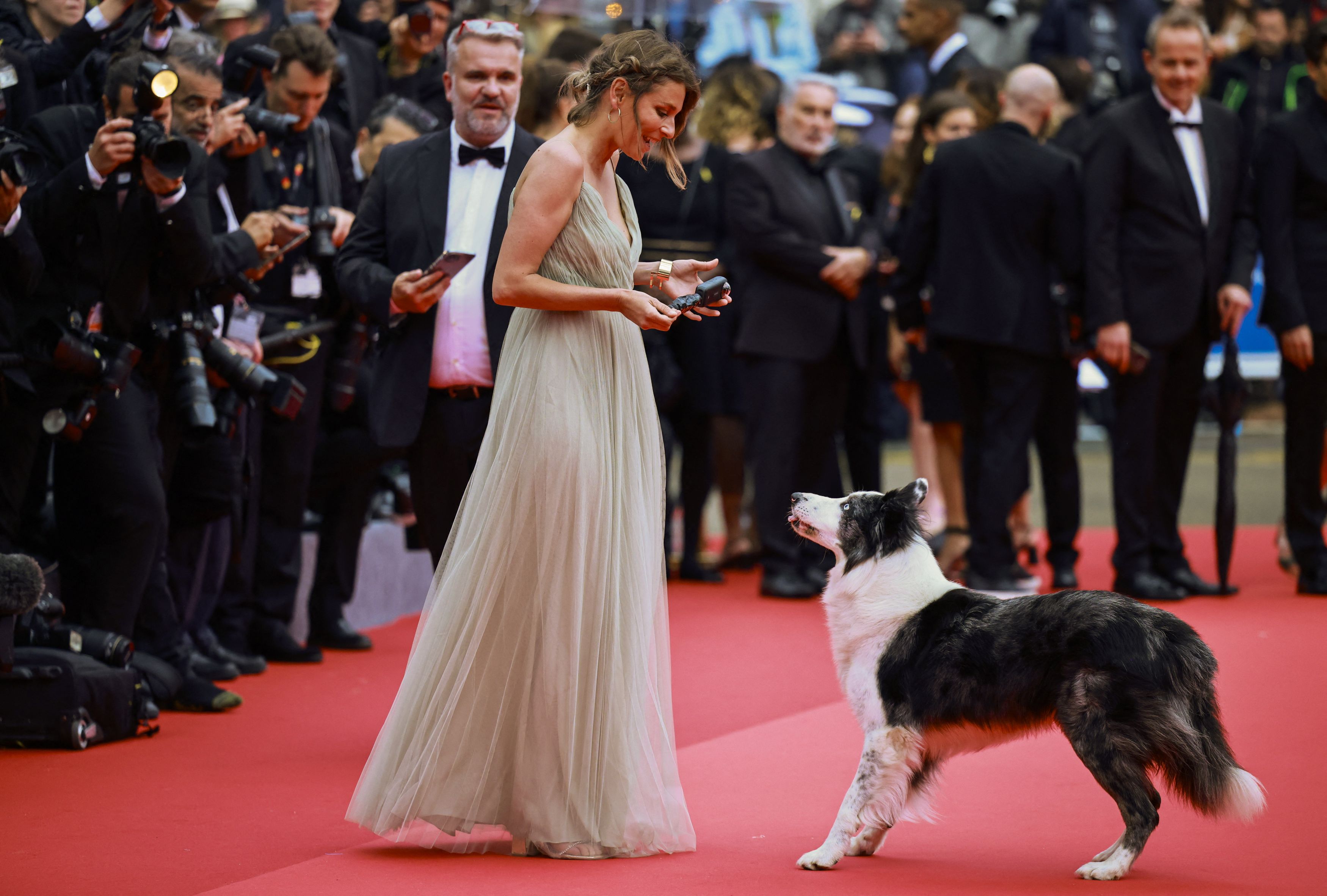 Messi, the dog from the film “Anatomie d'une chute” (Anatomy of a Fall), who is getting his own TV show at Cannes, interacts with Laura Martin Contini, dogtrainer for cinema, on the red carpet before guest arrivals for the opening ceremony at the 77th Cannes Film Festival in Cannes, France, May 14, 2024. (Photo by Yara Nardi/Reuters)