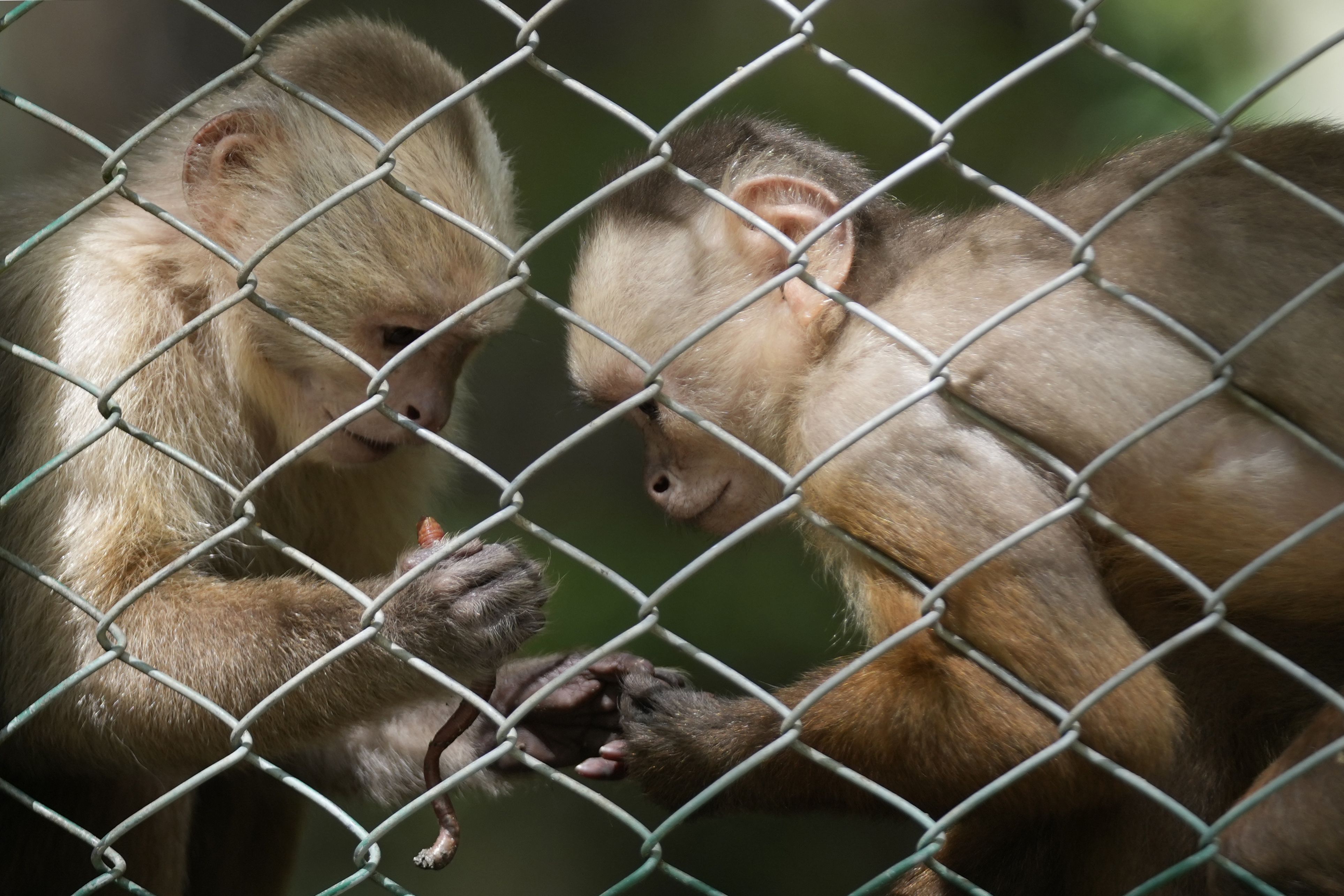 A white-faced capuchin holds an earthworm at a wildlife center in the rural Las Mercedes community of Tocaima, Colombia, Wednesday, May 22, 2024. The shelter is a transit home for wildlife recovered through national police seizures, rescue operations or voluntary handovers by owners. (Photo by Fernando Vergara/AP Photo)