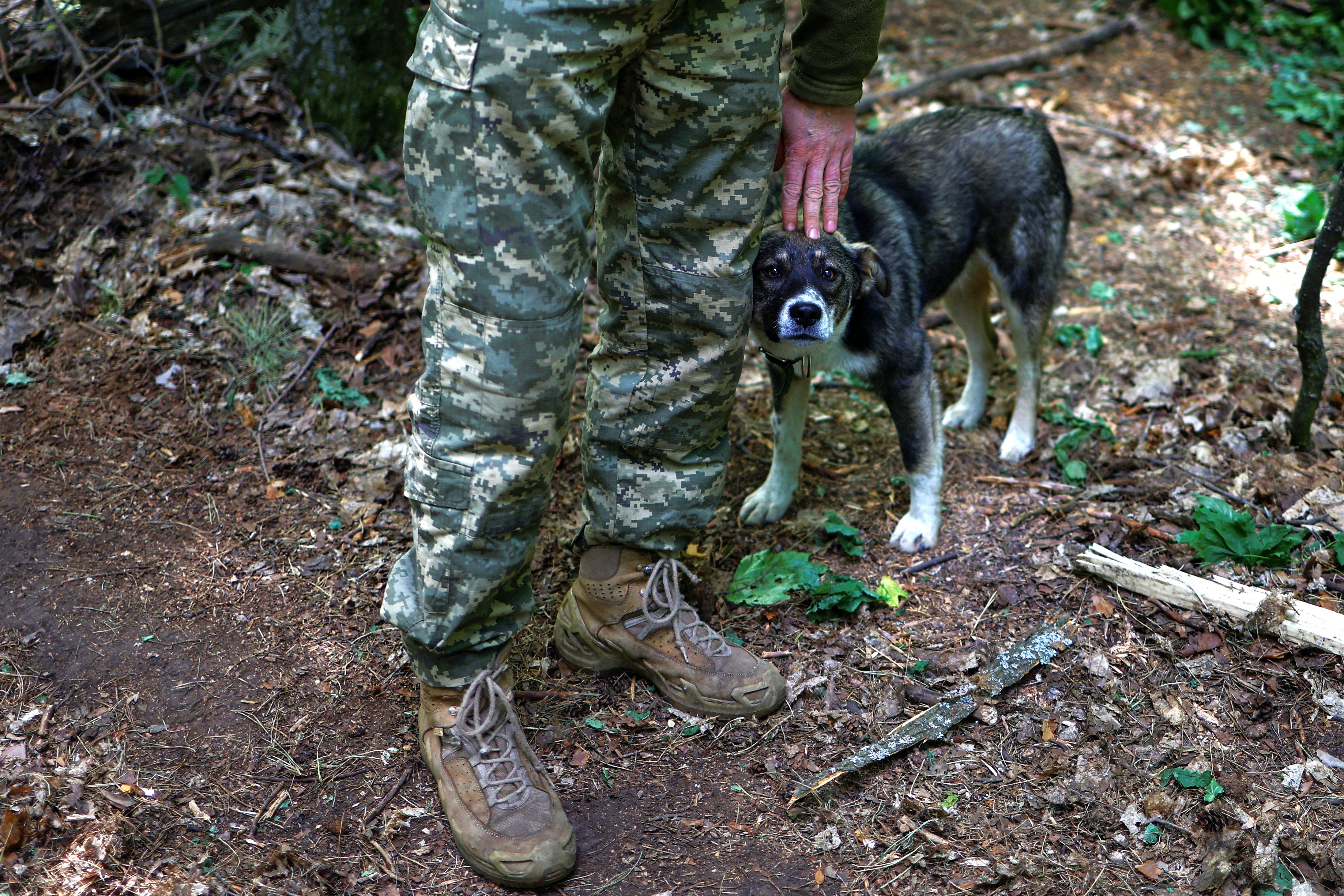 Ukrainian serviceman of the 42nd Separate Mechanized Brigade with the call sign 'Maestro' pets a dog with the name “Senator” at a frontline position in Kharkiv Region, Ukraine on May 16, 2024. (Photo by Valentyn Ogirenko/Reuters)