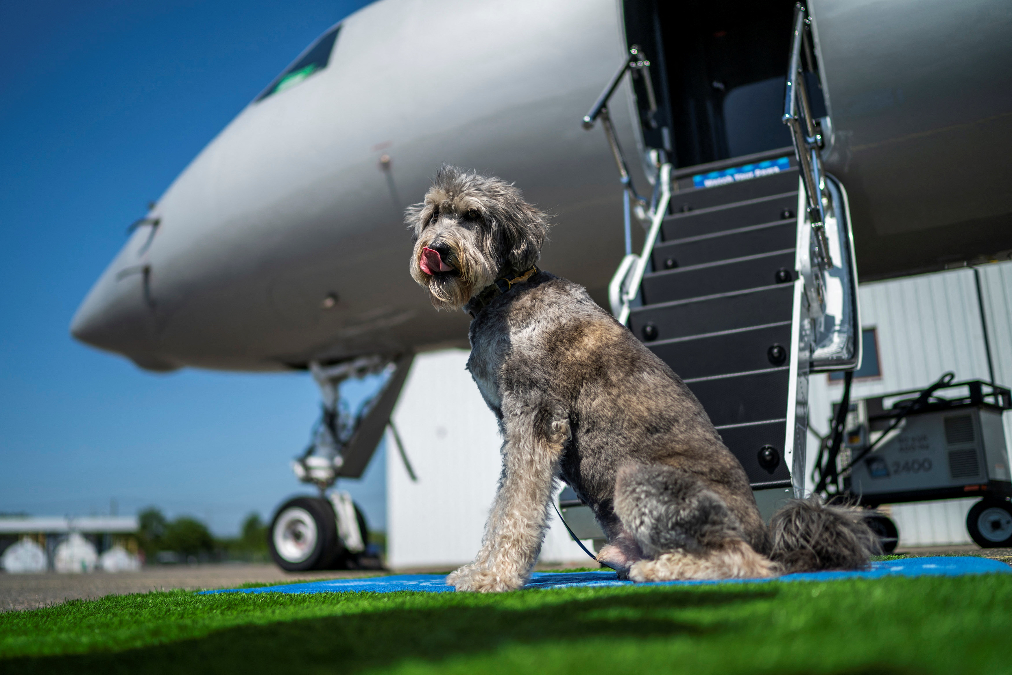 A dog waits to board'a plane during a press event introducing Bark Air, an airline for dogs, at Republic Airport in East Farmingdale, New York, on May 21, 2024. (Photo by Eduardo Munoz/Reuters)