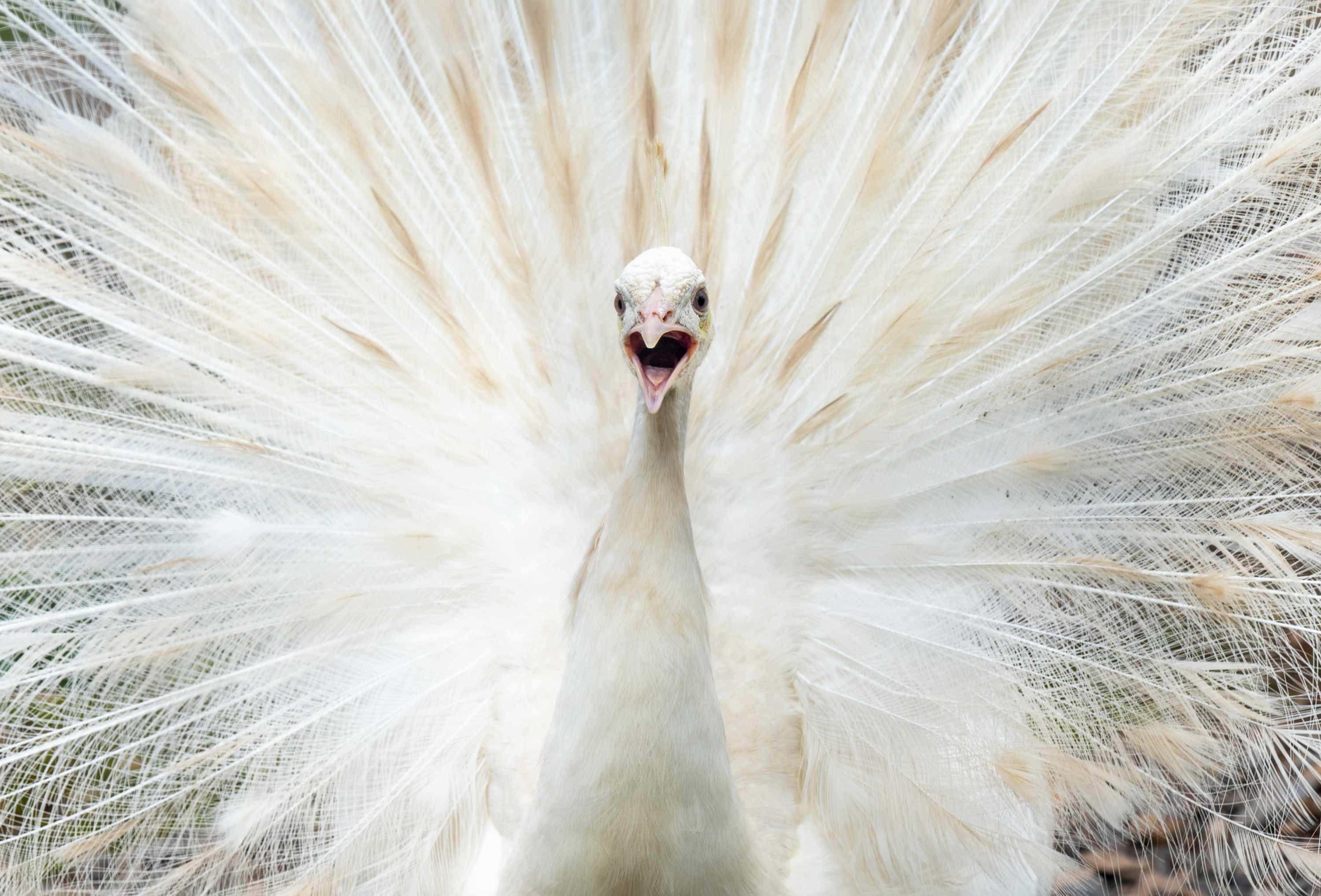 A male white peacock is one of the new residents at Bird Gardens Scotland in Oxton, Scottish Borders on May 24, 2024. He is making his presence known as he displays its white feathers. Their feathers are white due to a genetic mutation known as leucism, which inhibits melanin from being deposited in their feathers. (Photo by Phil Wilkinson/The Times)