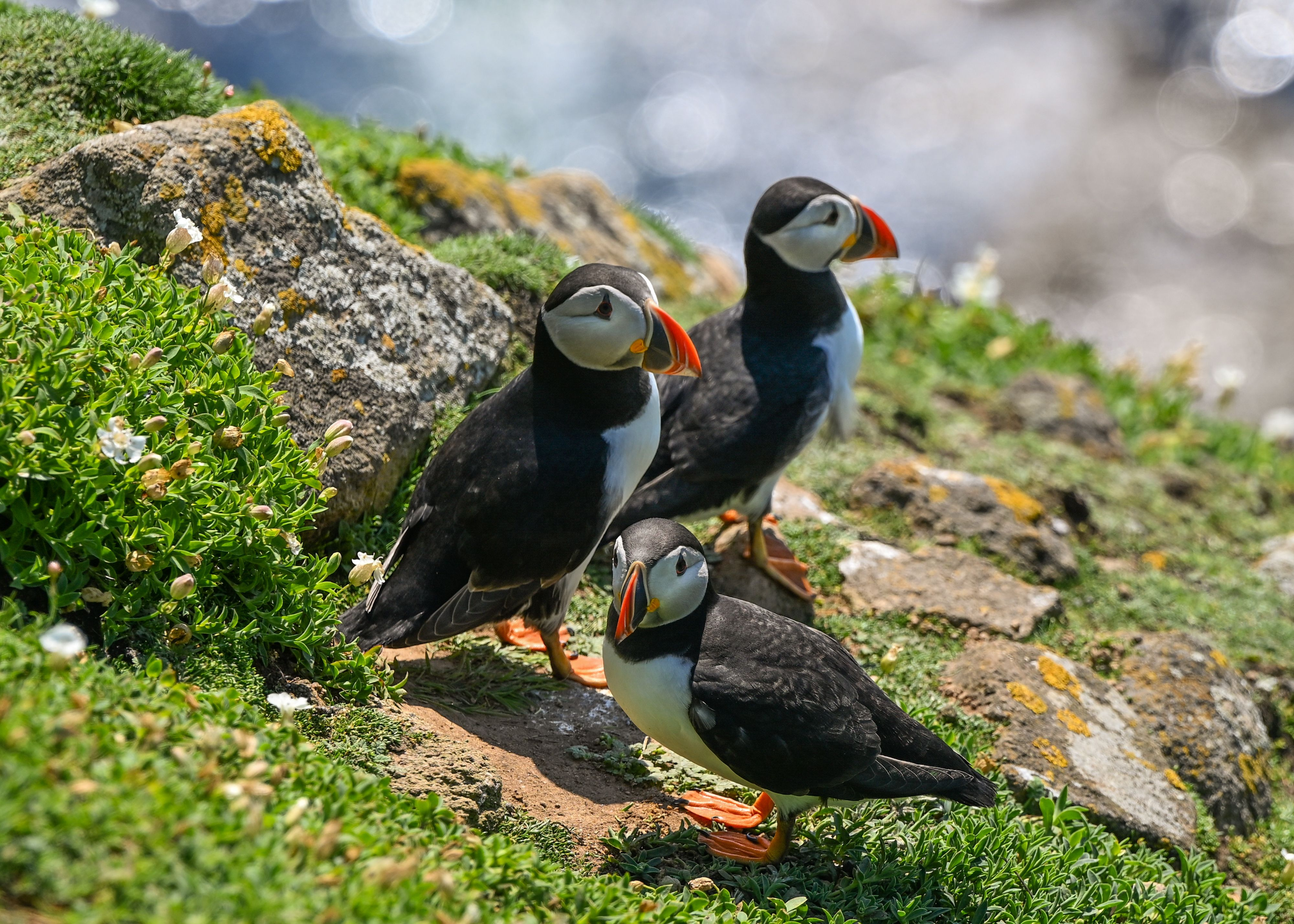 Three Atlantic puffins during breeding season on Great Saltee Island, on May 21, 2024, in Great Saltee, Saltee Islands, County Wexford, Ireland. The uninhabited Saltee Islands off Ireland's southeastern coast are a seabird paradise and crucial breeding ground for species like fulmars, gannets, shags, kittiwakes, guillemots, razorbills, and puffins, situated along an important migration route. (Photo by Artur Widak/NurPhoto/Rex Features/Shutterstock)