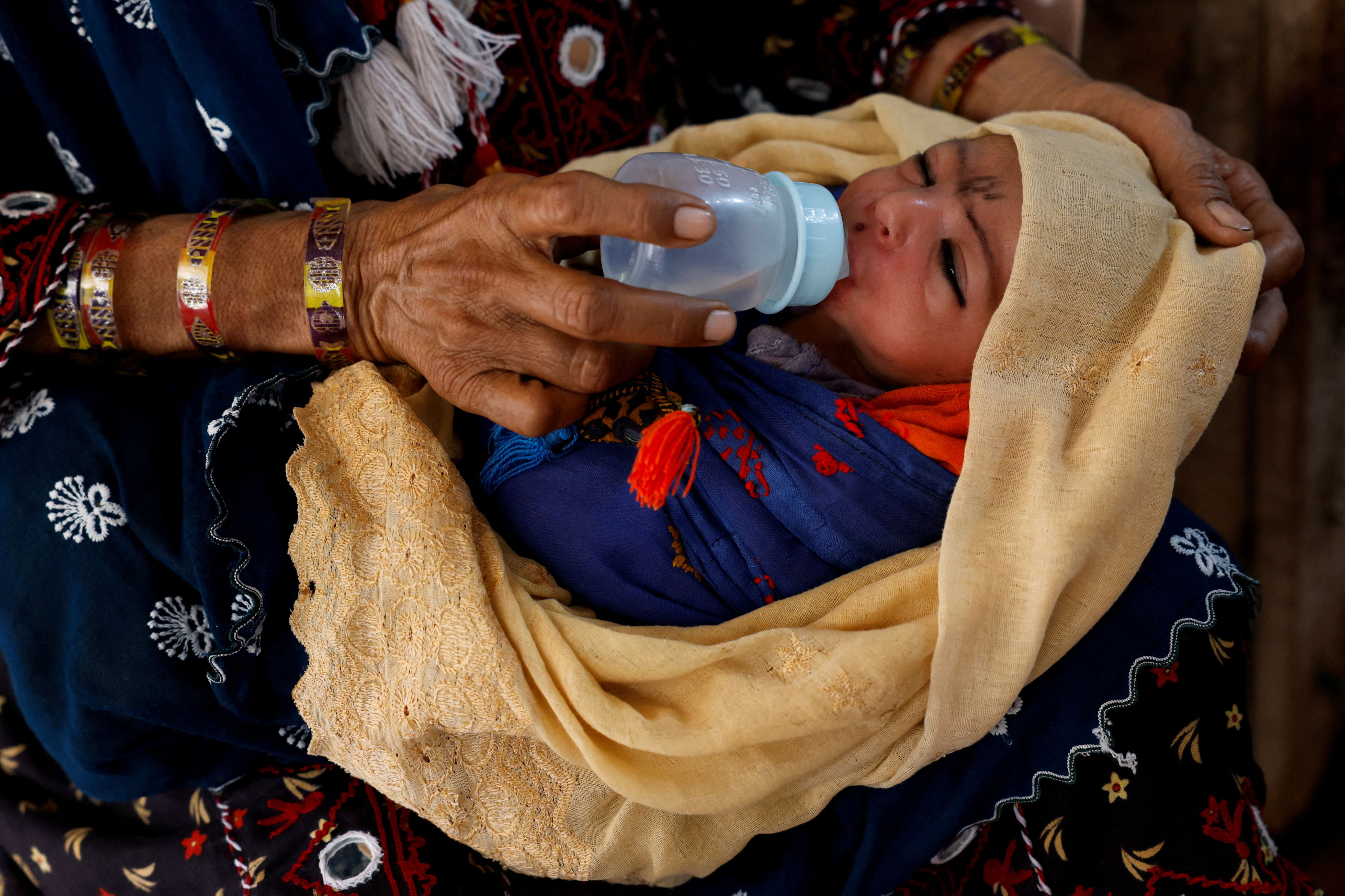 A mother gives water to her six-day-old baby, Darya Khan, to cool off during a hot summer day as the heatwave continues in Jacobabad, Pakistan on May 25, 2024. (Photo by Akhtar Soomro/Reuters)