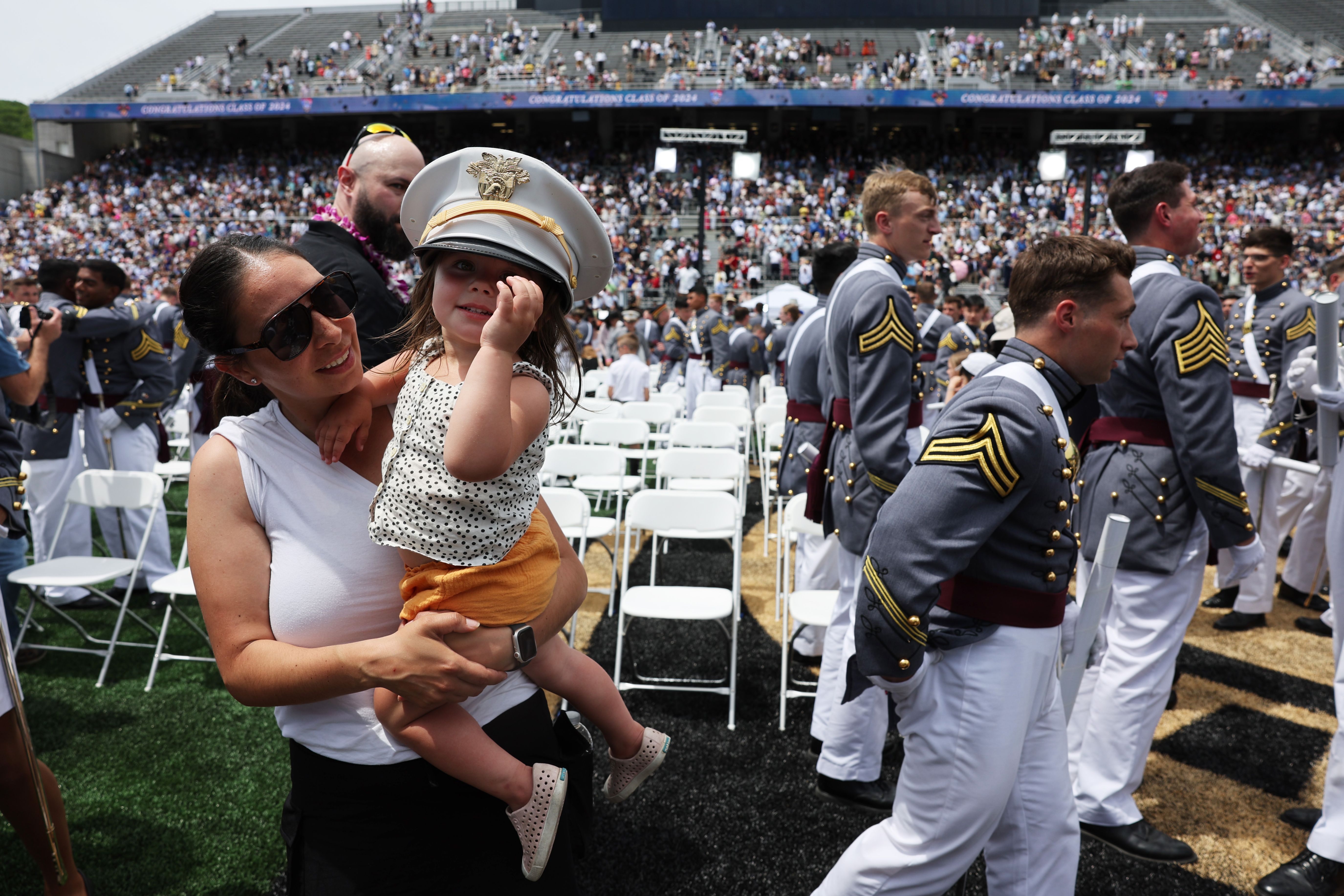 Children collect cadets hats following the West Point commencement exercises at Michie Stadium on May 25, 2024 in West Point, New York. U.S. President Joe Biden addressed the Class of 2024, which includes roughly 1,000 cadets graduating and commissioning into the Army as second lieutenants. (Photo by Spencer Platt/Getty Images)