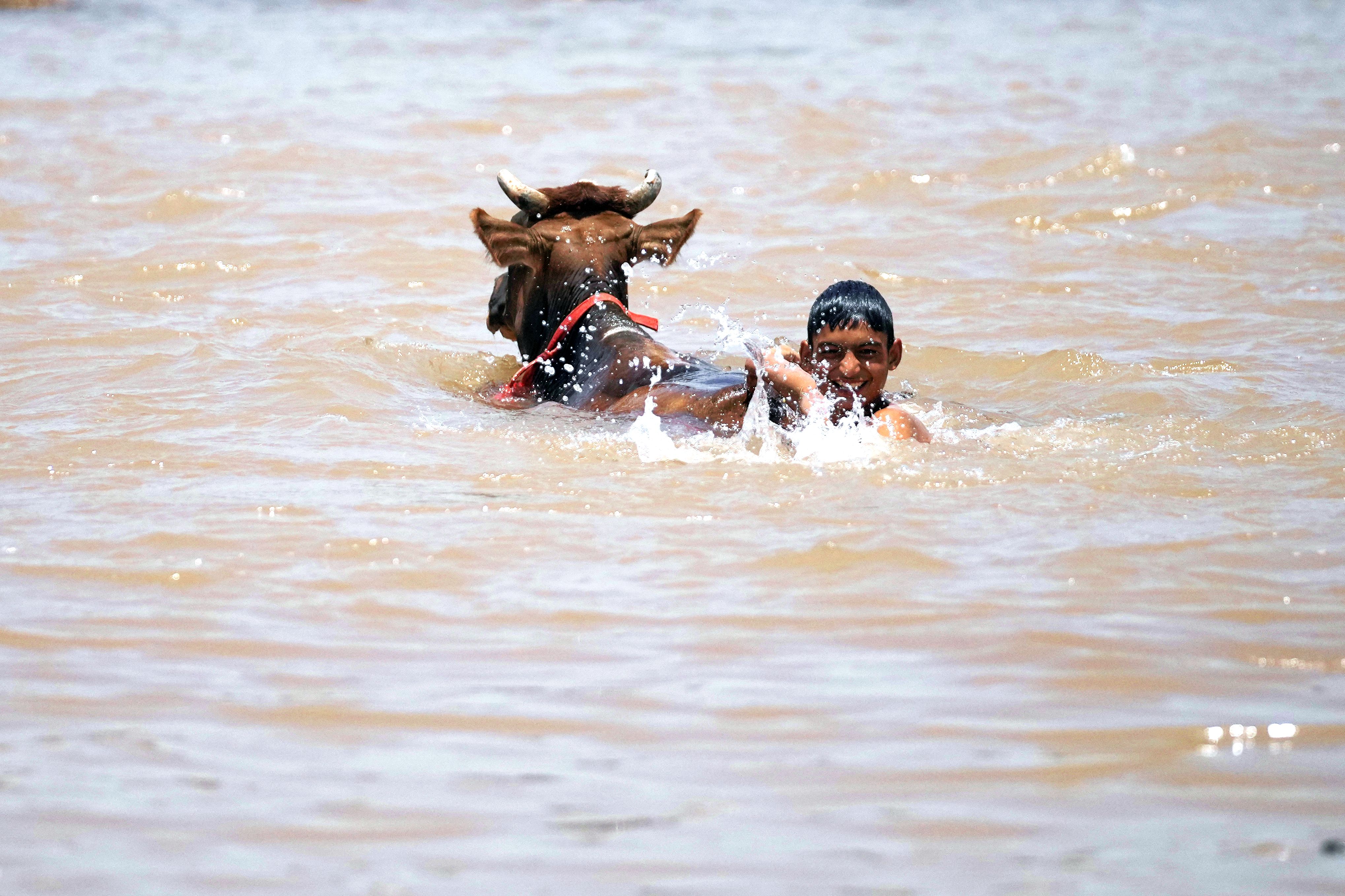 A boy bathes his cattle in the River Tawi on a hot summer day in Jammu, India, Tuesday, May 28, 2024. (Photo by Channi Anand/AP Photo)