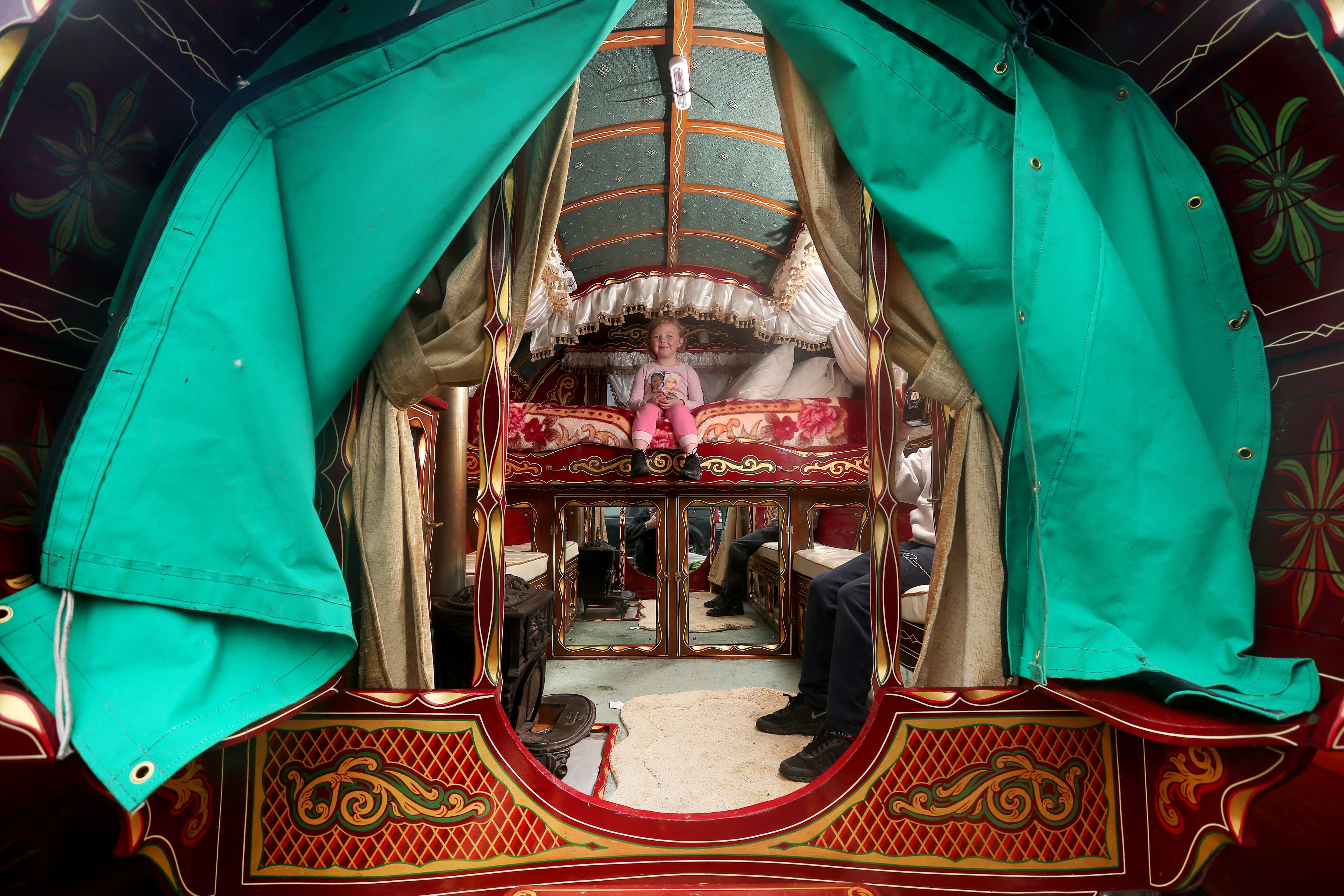 Dollie-Anna English, 4, from Bradford, gets comfy inside a traditional roll top caravan in Settle, North Yorkshire on May 28, 2024. She and her family are travelling to the Appleby Horse Fair, which begins next Thursday. (Photo by Lorne Campbell/Guzelian)