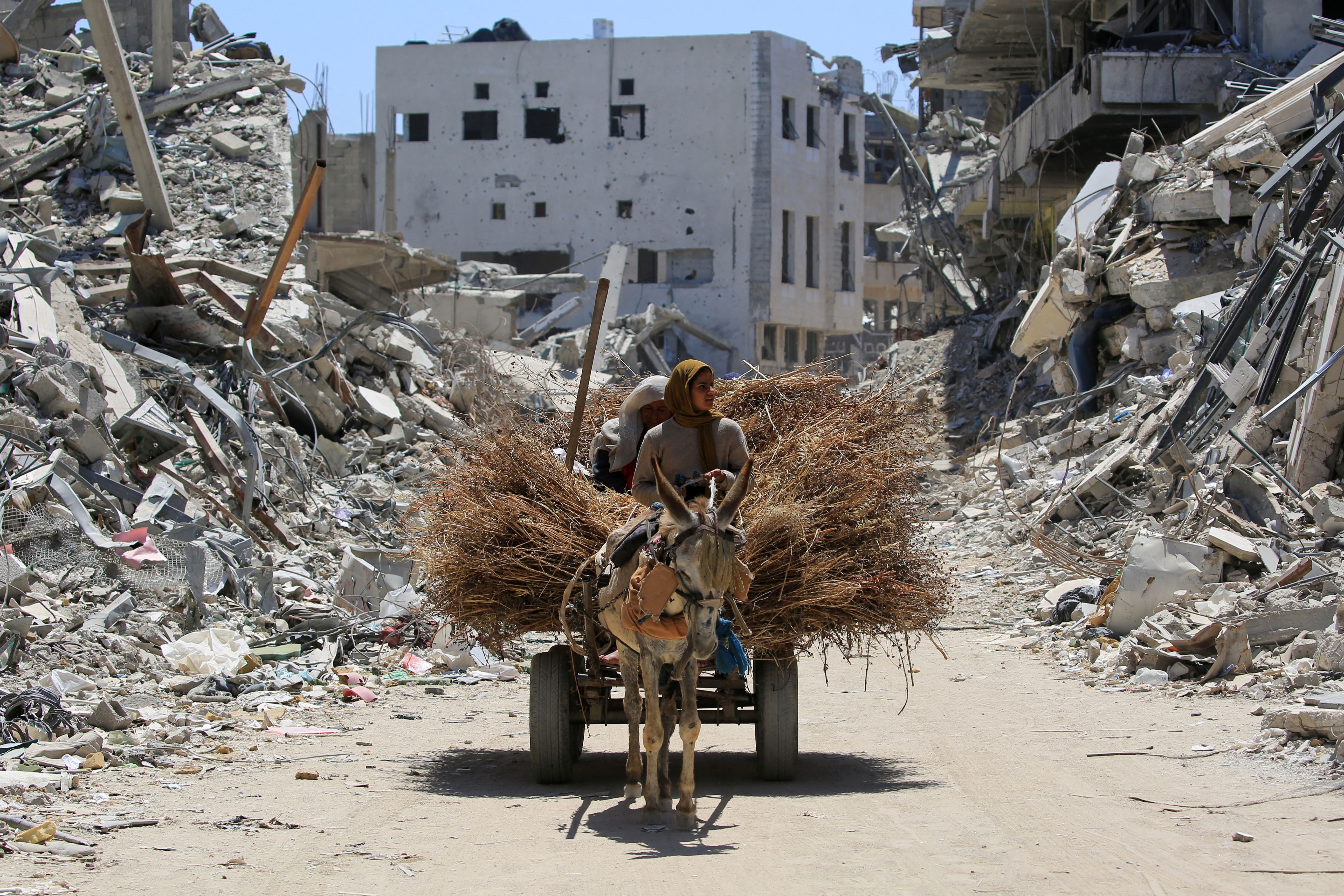 Women transport hay on a donkey-pulled cart along a devastated street in Khan Yunis in the southern Gaza Strip on May 24, 2024, as conflict between Israel and Hamas militants continues. (Photo by Eyad Baba/AFP Photo)
