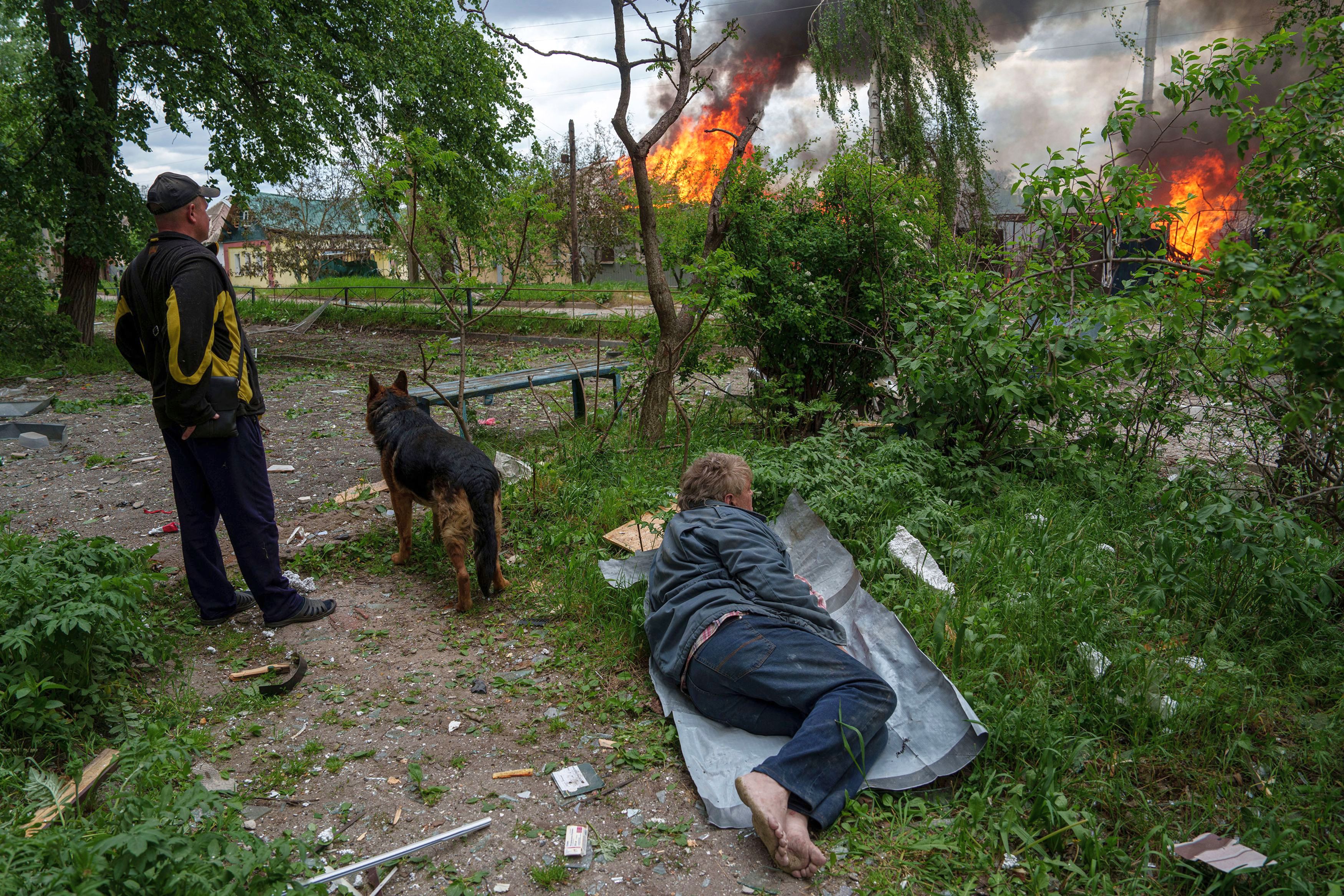 A man lies on the ground as he watches his burning house destroyed by a Russian airstrike in Vovchansk, Ukraine, on Saturday, May 11, 2024. (Photo by Evgeniy Maloletka/AP Photo)