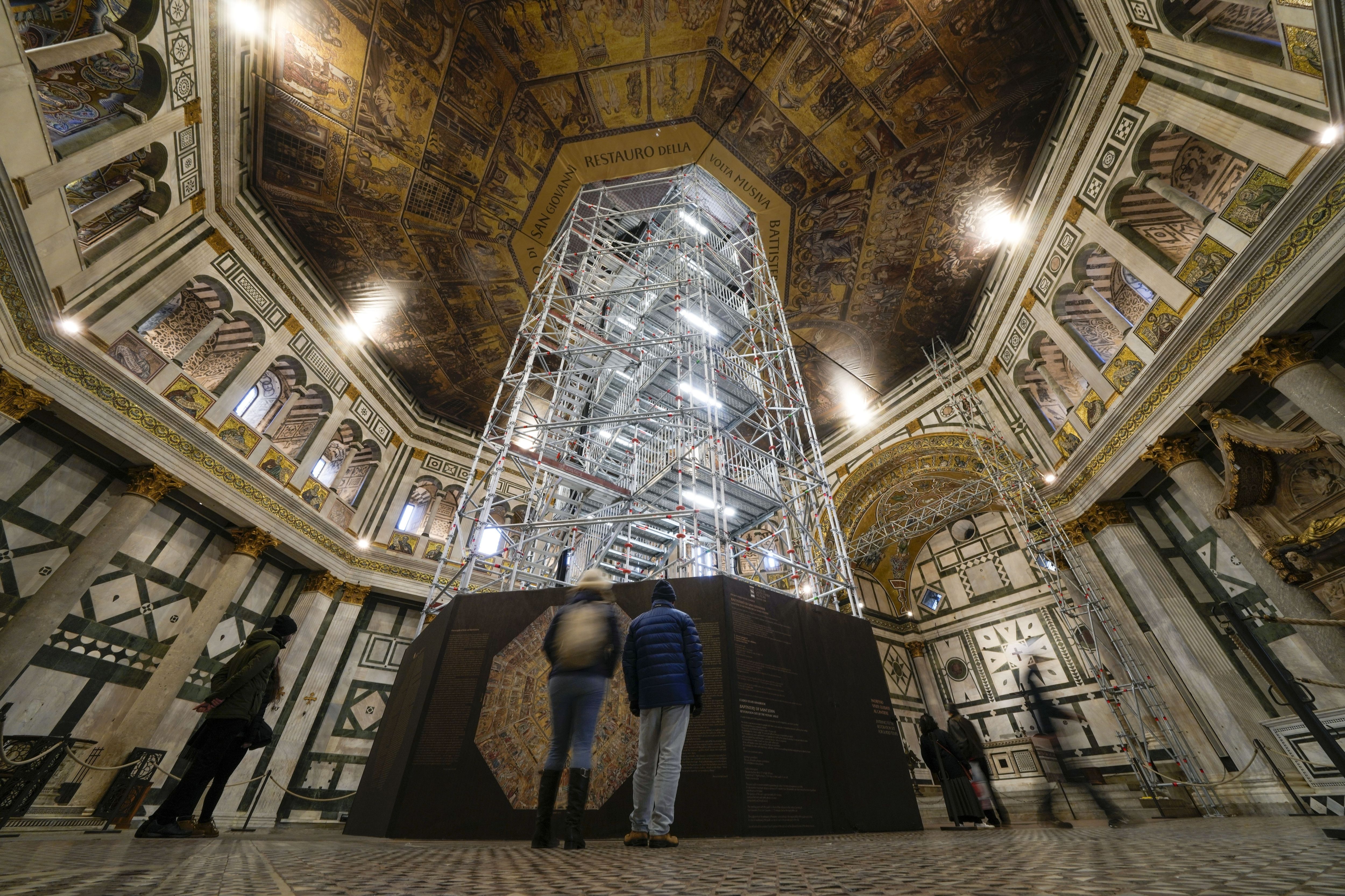 Visitors admire St. John's Baptistery, one of the oldest churches in Florence, central Italy, Tuesday, February 7, 2023. The Baptistery's dome is undergoing a restoration work that will be done from an innovative scaffolding shaped like a giant mushroom that will stand for the next six years in the center of the church, and that will be open to visitors allowing them for the first and perhaps only time, to come come face to face with more than 1,000 square meters of precious mosaics covering the dome. (Photo by Andrew Medichini/AP Photo)