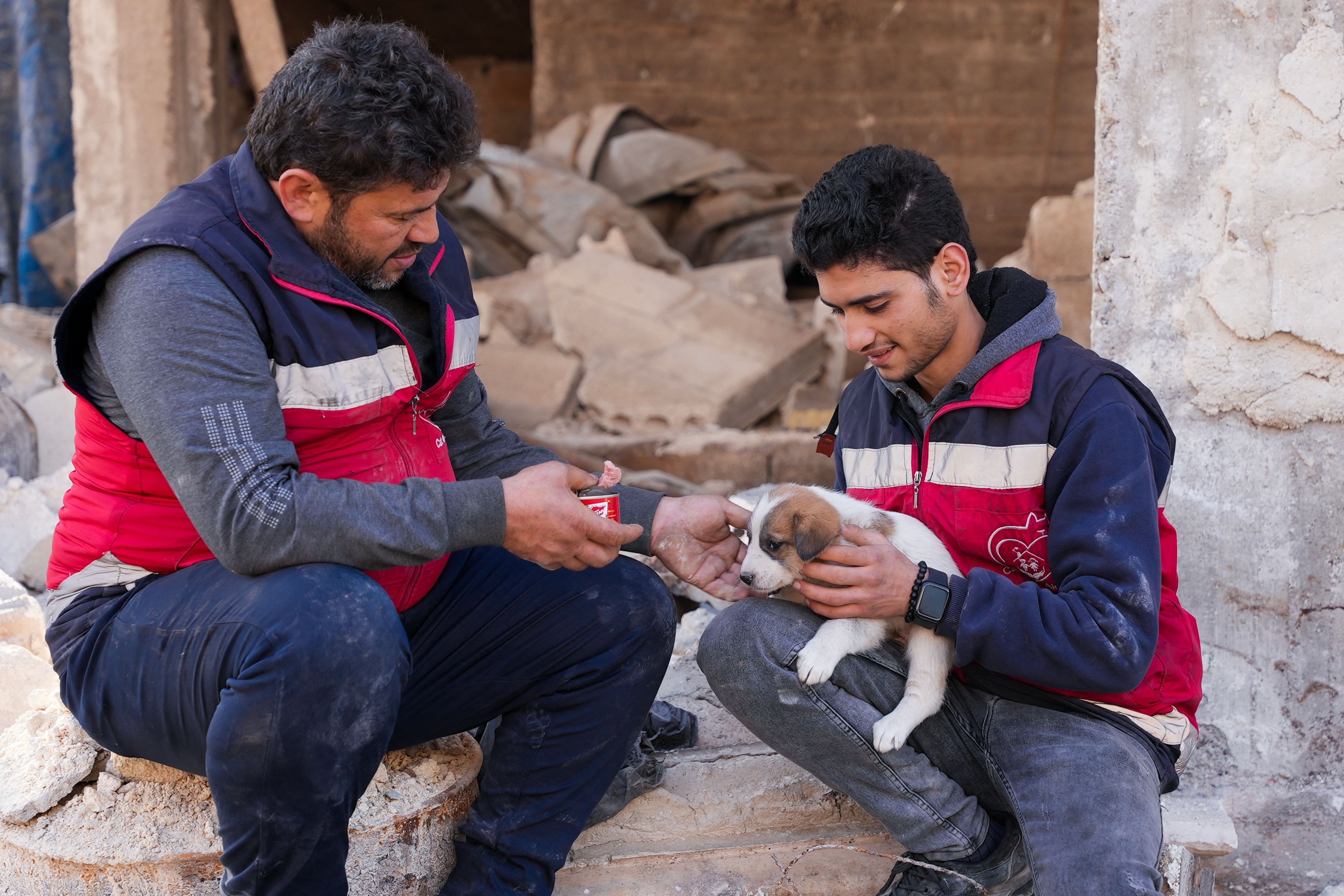In this picture taken on February 24, 2023, volunteer Mohammed Alaa al-Jalil (L) and his colleague rescue a dog from the rubble of an earthquake-devasted building in Jindayris, in the rebel-held Syrian province of Aleppo. A 7.8-magnitude quake struck Syria and Turkey in early February, killing more than 45,000 people across both countries. (Photo by Rami al Sayed/AFP Photo)