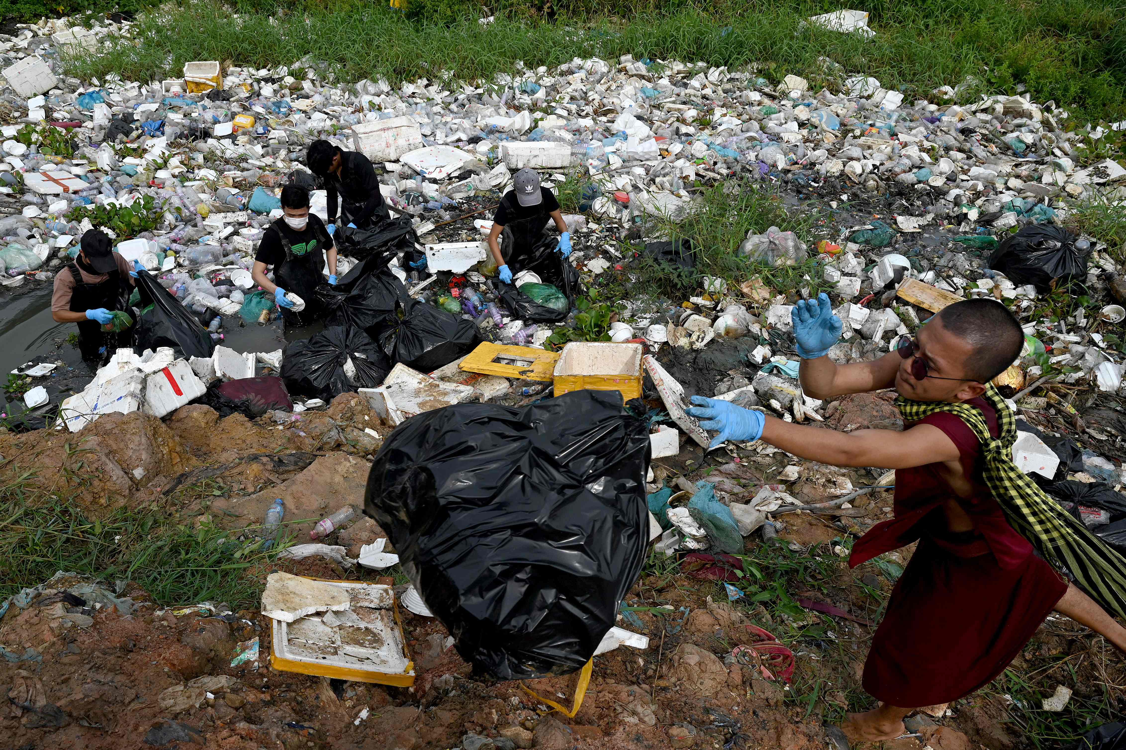 Volunteer students and Buddhist monks collect plastic waste from a sewage canal to set an example and educate people on proper plastic disposal in Phnom Penh on October 28, 2023. (Photo by Tang Chhin Sothy/AFP Photo)