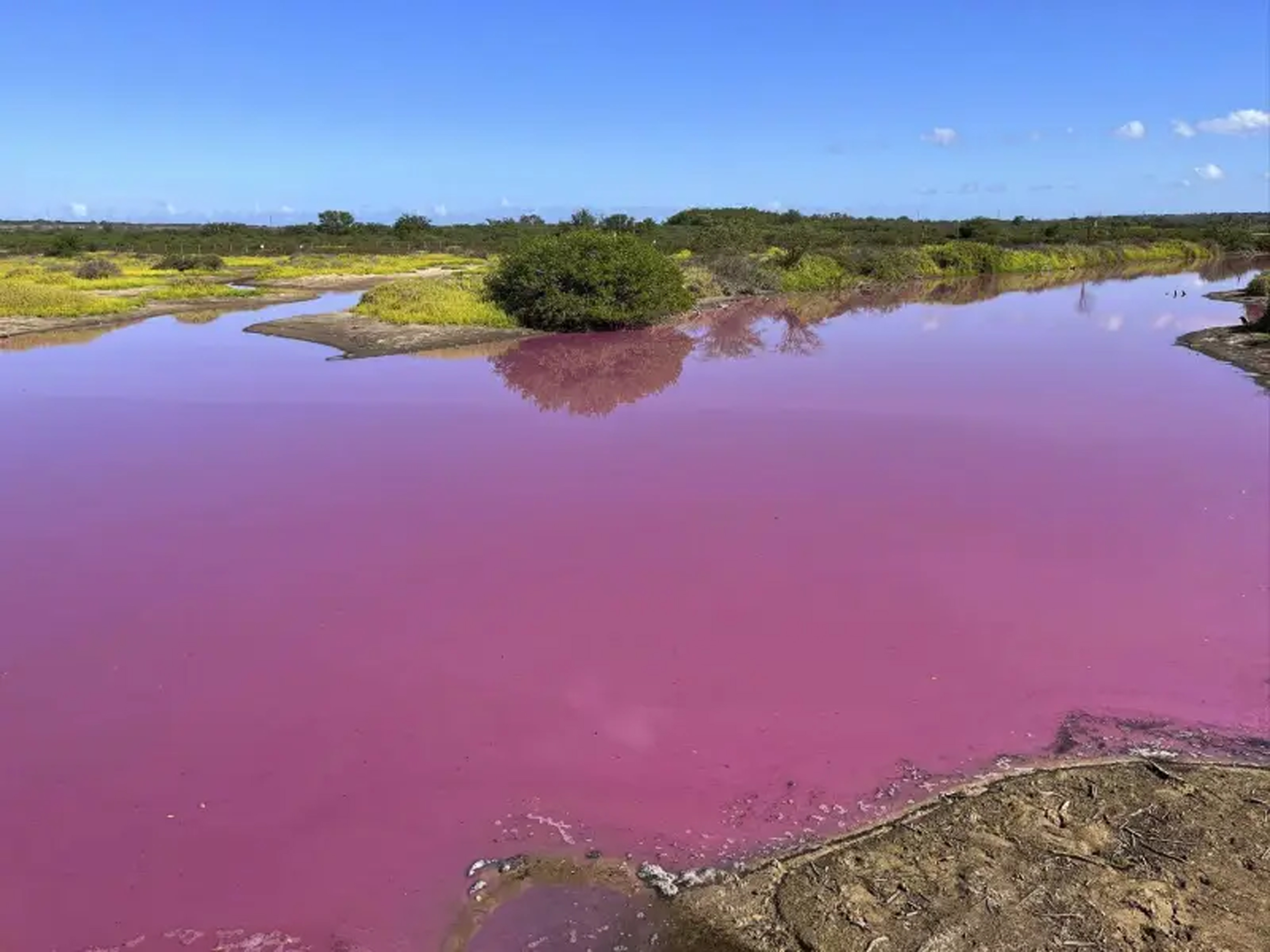 This November 8, 2023, photo provided by Leslie Diamond shows the pond at the Kealia Pond National Wildlife Refuge on Maui, Hawaii, that turned pink on Oct. 30, 2023. Officials in Hawaii are investigating why the pond turned pink, but there are some indications that drought may be to blame. (Photo by Leslie Diamond via AP Photo)
