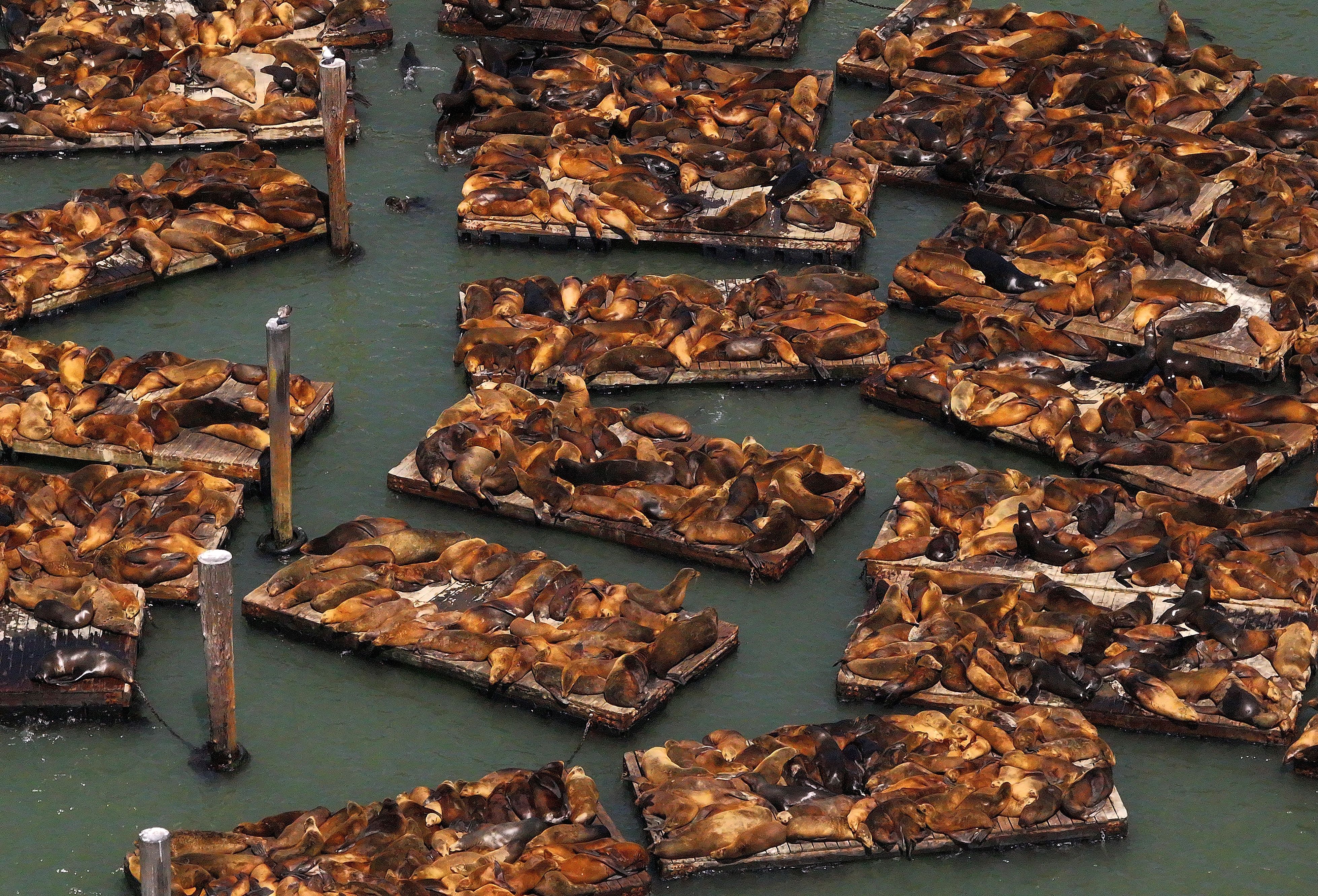 In an aerial view, California sea lions lounge on docks at Pier 39 on May 05, 2024 in San Francisco, California. Over 1,000 California sea lions are hanging out on the docks at popular San Francisco tourist destination Pier 39. The surge in number of sea lions in the area is due to large schools of anchovies and herring in the bay waters that will allow them to fuel up before mating season next month. The sea lions have been a top attraction at Pier 39 for nearly 35 years. (Photo by Justin Sullivan/Getty Images)