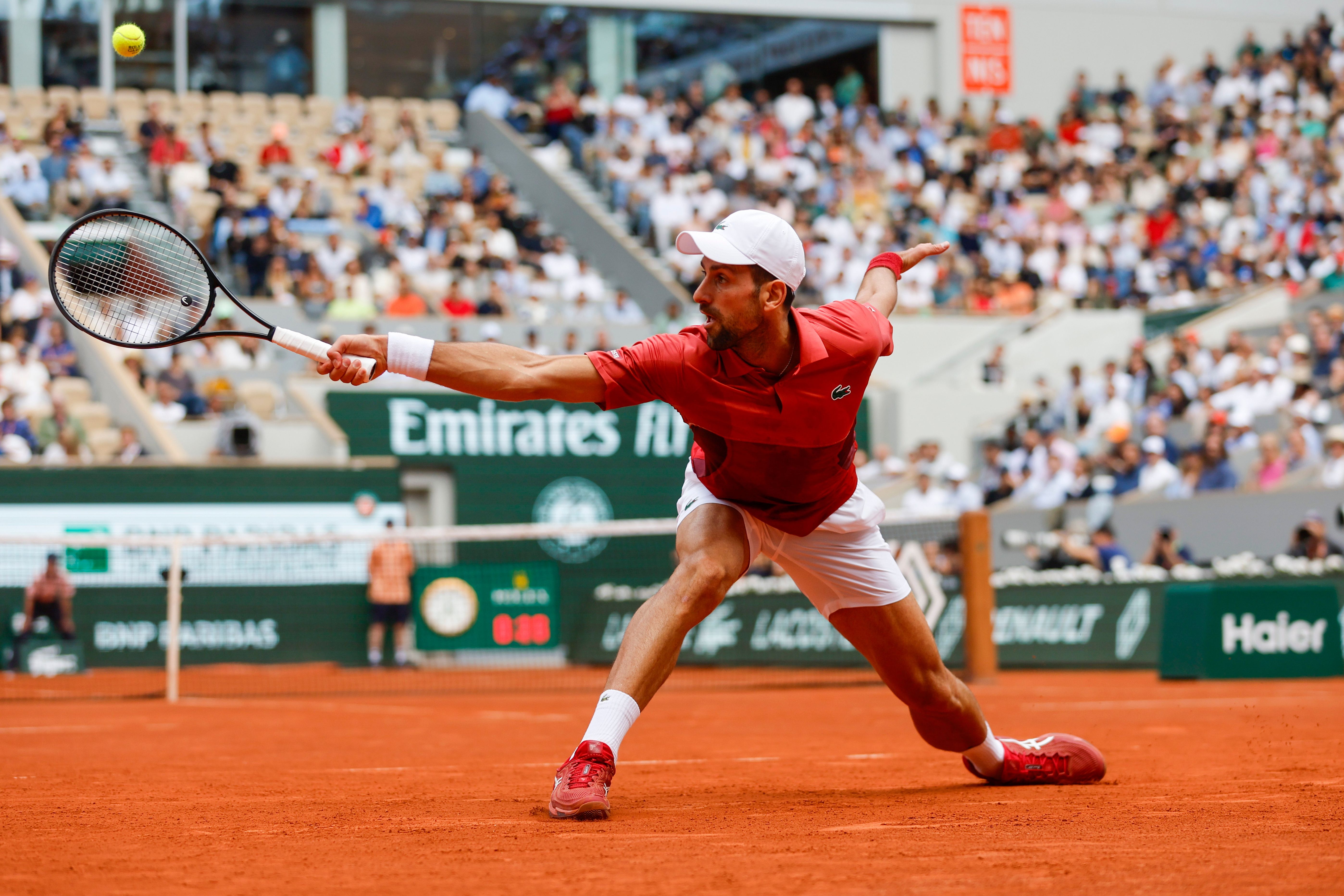 Serbia's Novak Djokovic plays a shot against Argentina's Francisco Cerundolo during their fourth round match of the French Open tennis tournament at the Roland Garros stadium in Paris, Monday, June 3, 2024. (Photo by Jean-Francois Badias/AP Photo)