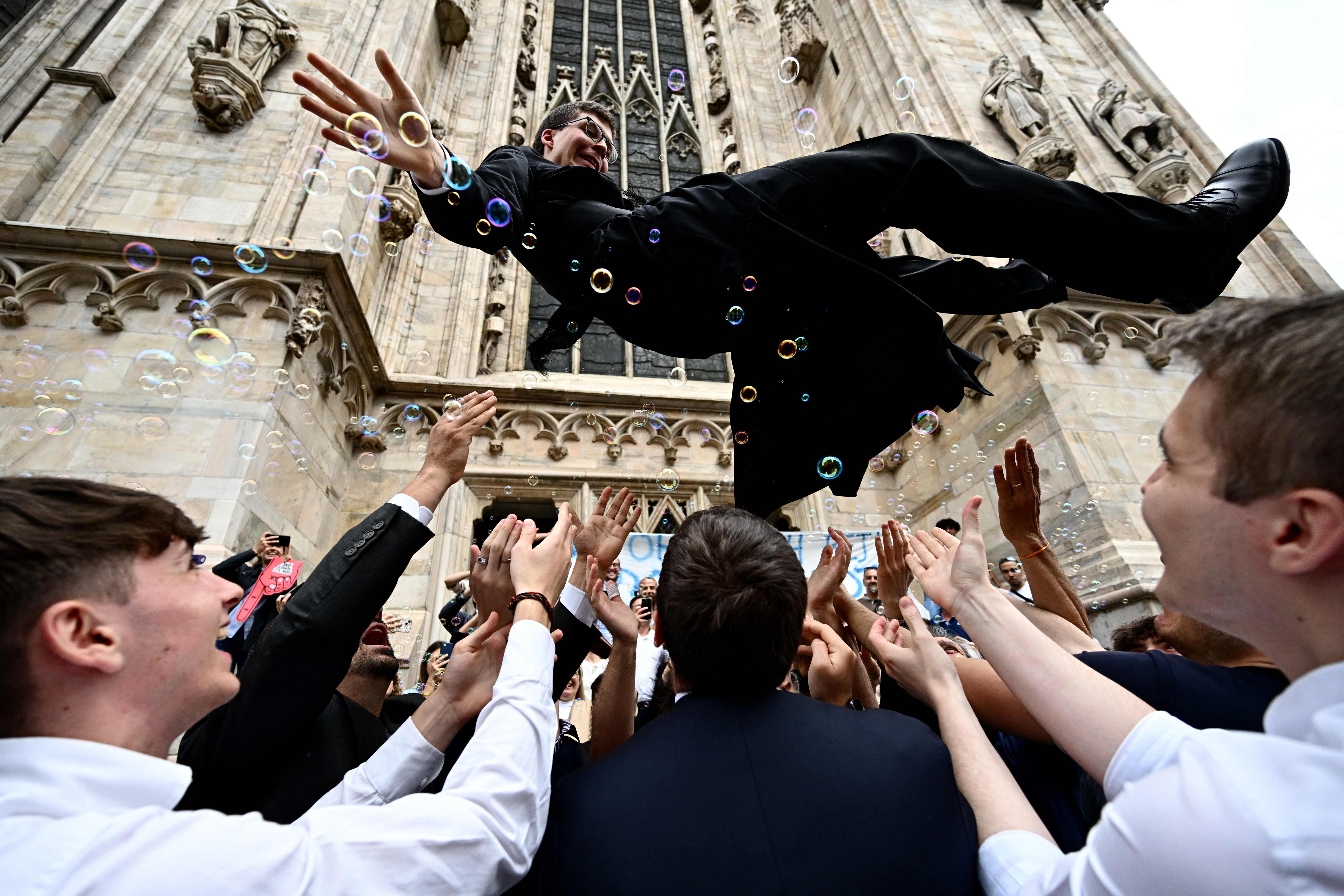 A newly ordered Catholic priest celebrates with friends and relatives outside the Duomo Cathedral, in Milan, after the ordination ceremony on June 10, 2023. (Photo by Gabriel Bouys/AFP Photo)