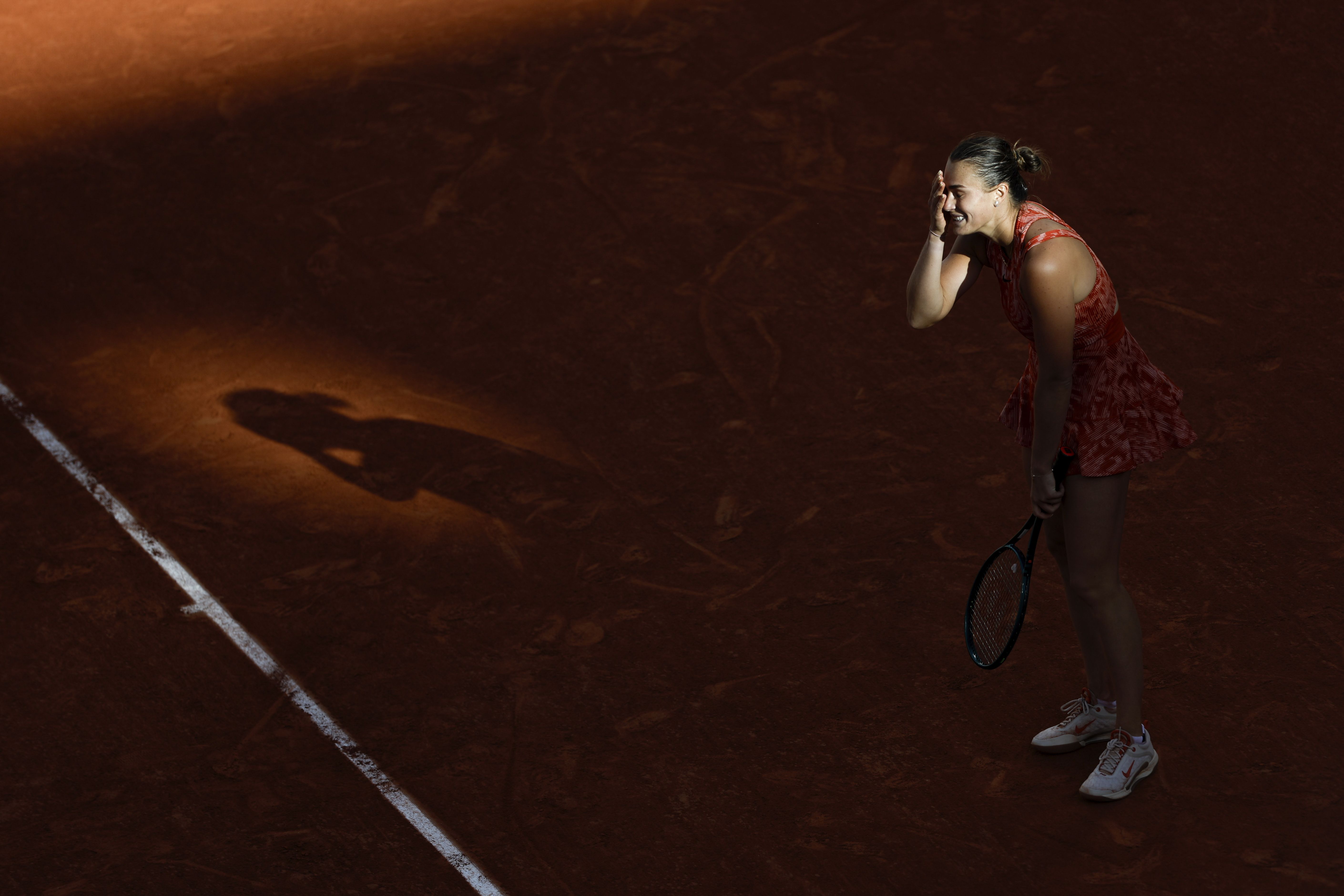 Aryna Sabalenka of Belarus reacts after missing a shot against Russia's Mirra Andreeva during their quarterfinal match of the French Open tennis tournament at the Roland Garros stadium in Paris, Wednesday, June 5, 2024. (Photo by Aurelien Morissard/AP Photo)