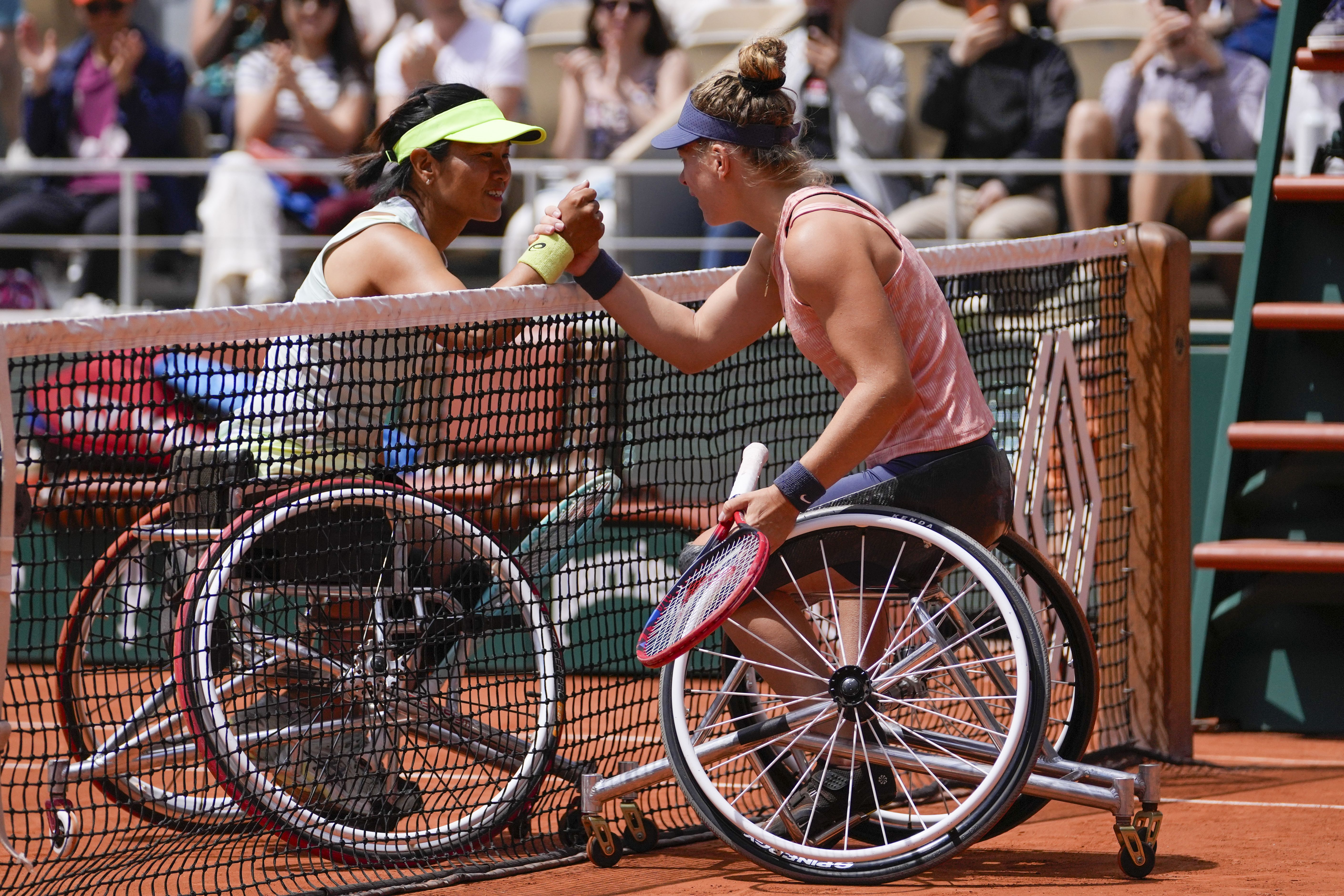 Netherlands' Diede de Groot, right, is congratulated by China's Zhang Zhizhen after winning the women's wheelchair final match of the French Open tennis tournament at the Roland Garros stadium in Paris, France, Saturday, June 8, 2024. (Photo by Thibault Camus/AP Photo)