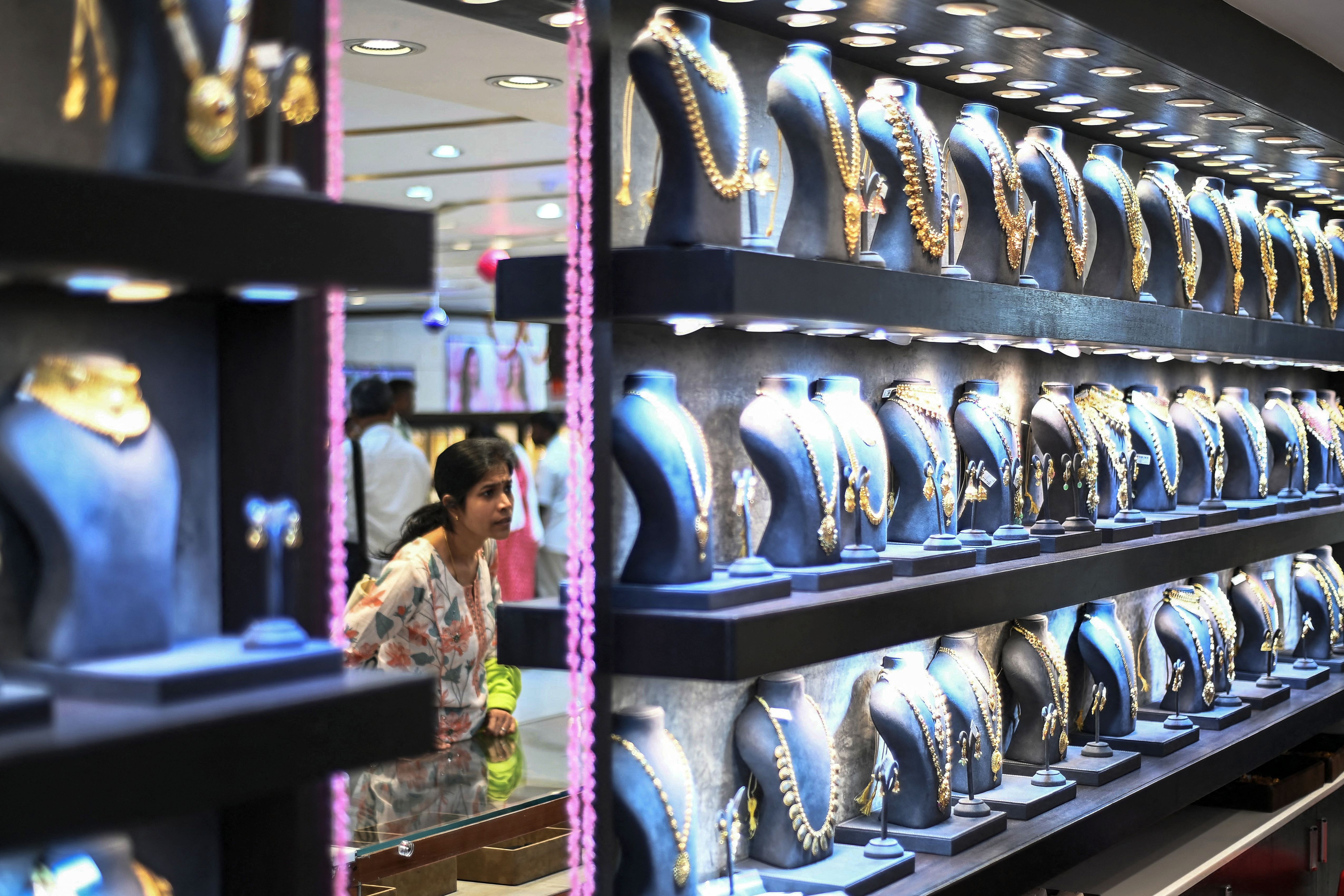A woman buys gold jewellery during the Hindu festival of 'Akshaya Tritiya', considered to be an auspicious day in the Hindu calendar to buy valuables with the belief that it will increase their wealth, at a jewellery shop in Chennai on May 10, 2024. (Photo by R. Satish Babu/AFP Photo)