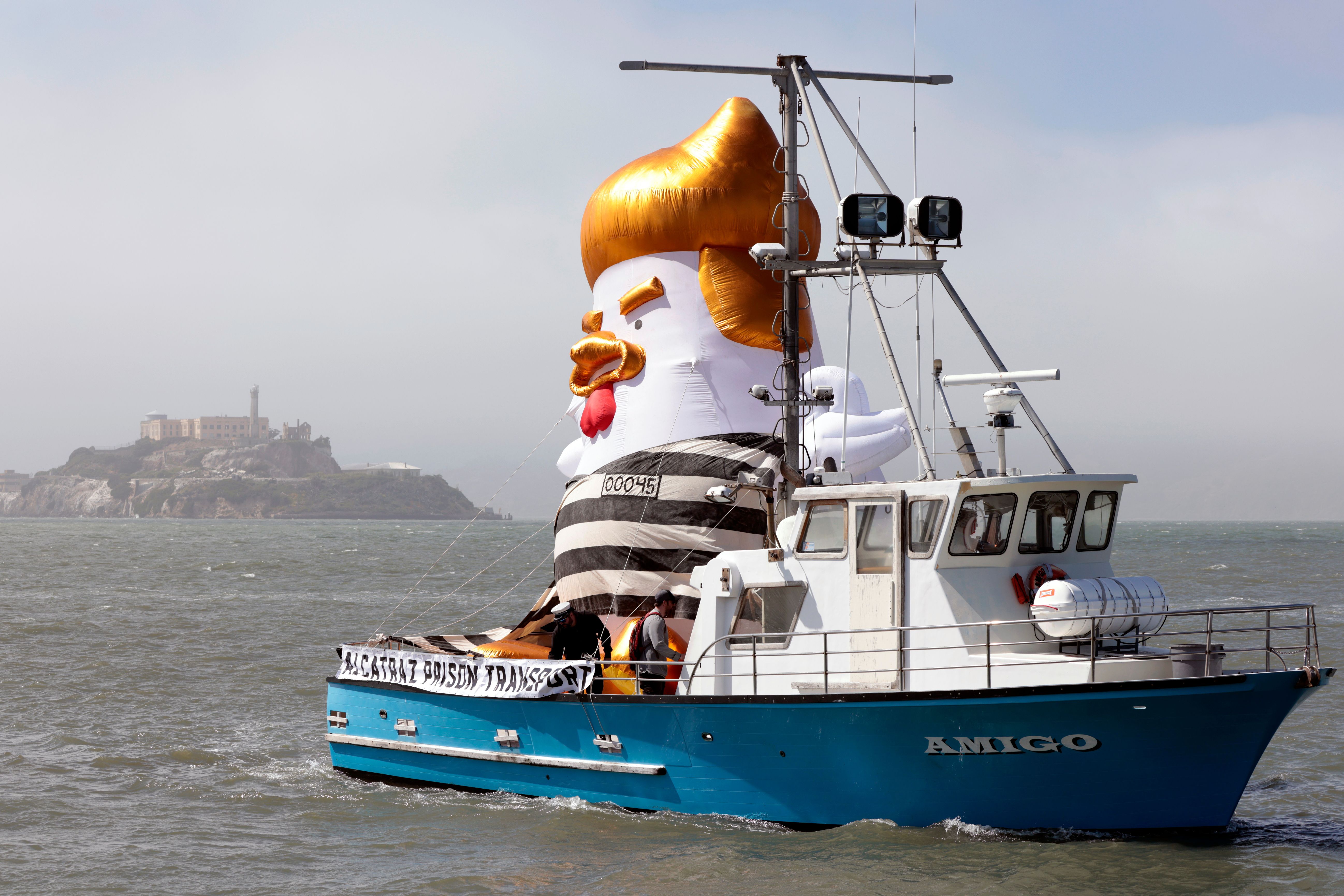 An inflatable “Trump Chicken” balloon, wearing a black-and-white-striped convict top, sails in protest in front of Alcatraz Island (a former maximum security federal penitentiary) during a protest of former President Donald J. Trump’s visit for a fundraiser, in San Francisco, California, USA, 06 June 2024. (Photo by John G. Mabanglo/EPA/EFE)