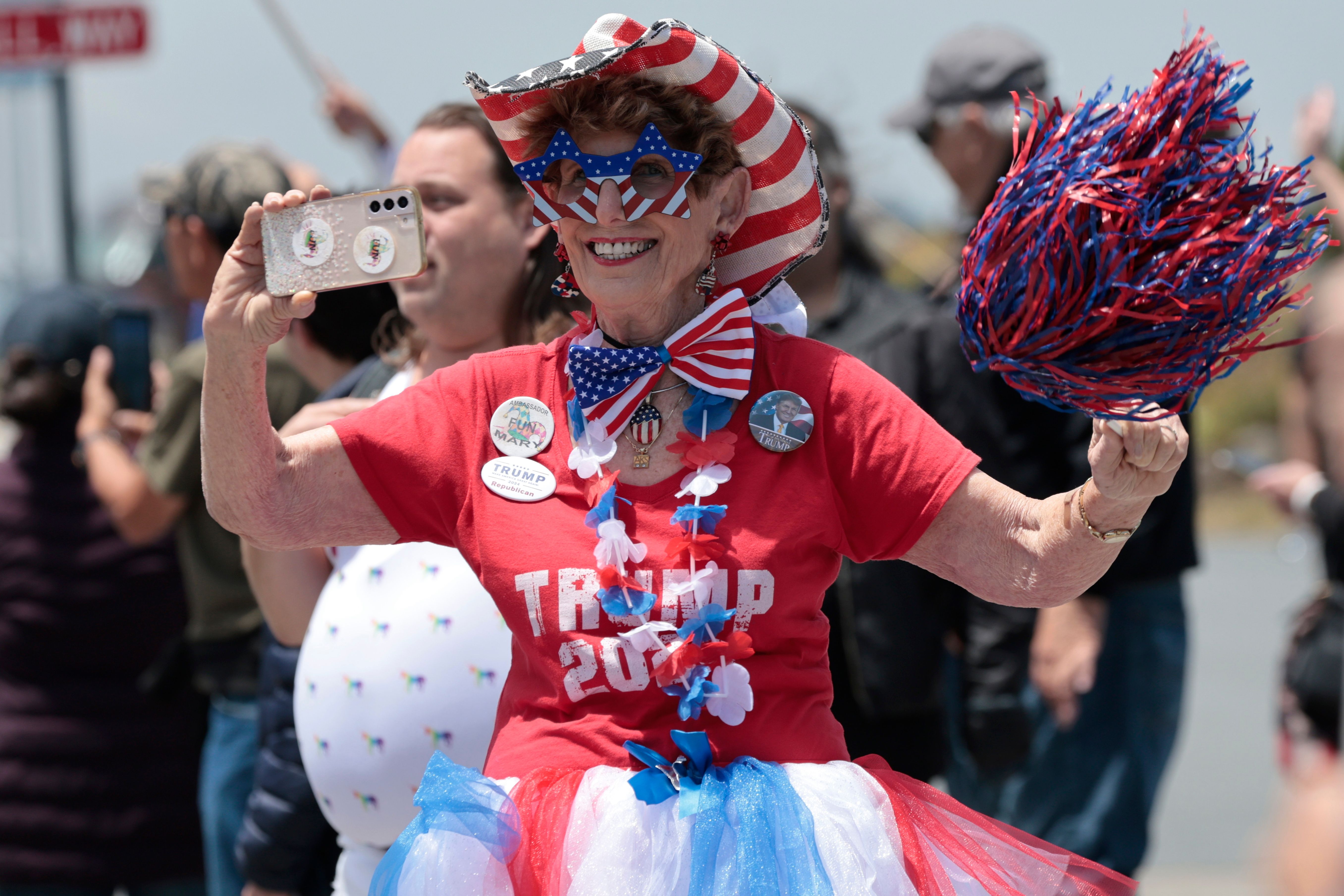 A pro-Trump supporter shows her support before former President Donald J. Trump visits a fundraiser in San Francisco, California, USA, 06 June 2024. (Photo by John G. Mabanglo/EPA/EFE)