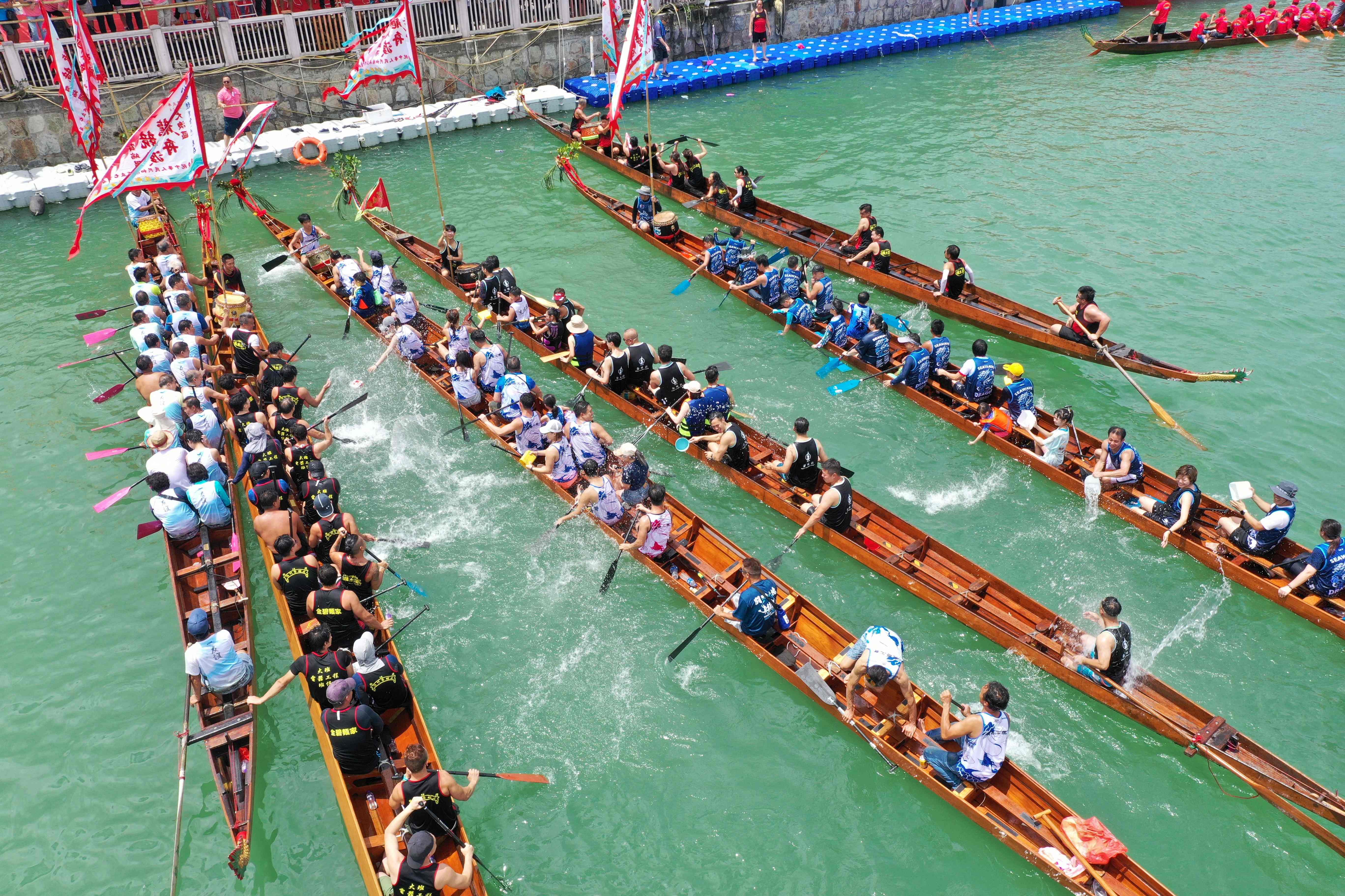 This aerial photo shows rowers in their dragon boats at Tai O fishing village on Lantau Island in Hong Kong on June 10, 2024 as they take part in the dragon boat races held to celebrate the Tuen Ng Festival (Dragon Boat Festival). (Photo by Peter Parks/AFP Photo)