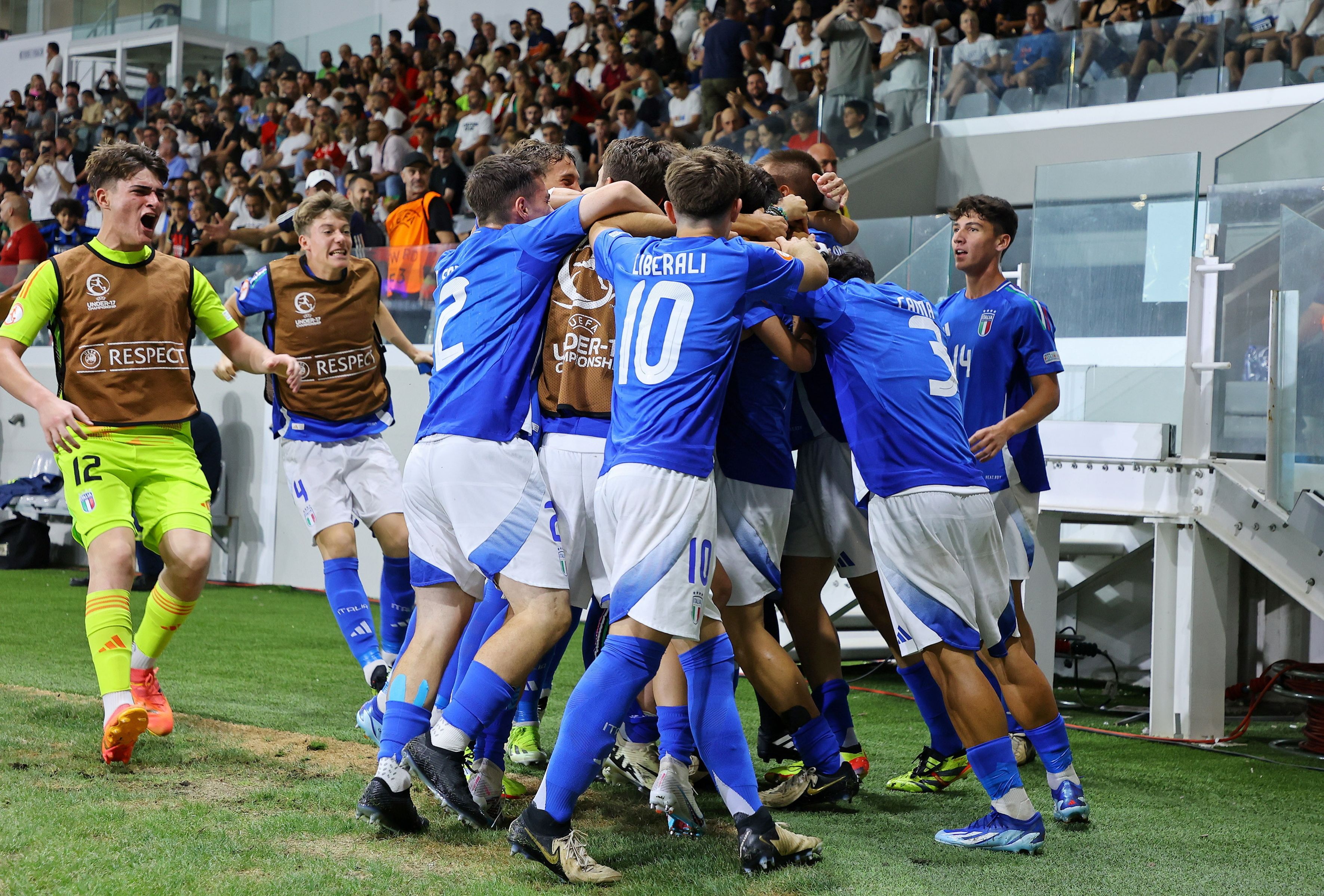 Players of Italy celebrate after scoring the opening goal during the UEFA Under-17 final between Italy and Portugal in Limassol, Cyprus, 05 June 2024. (Photo by Chara Savvides/EPA)