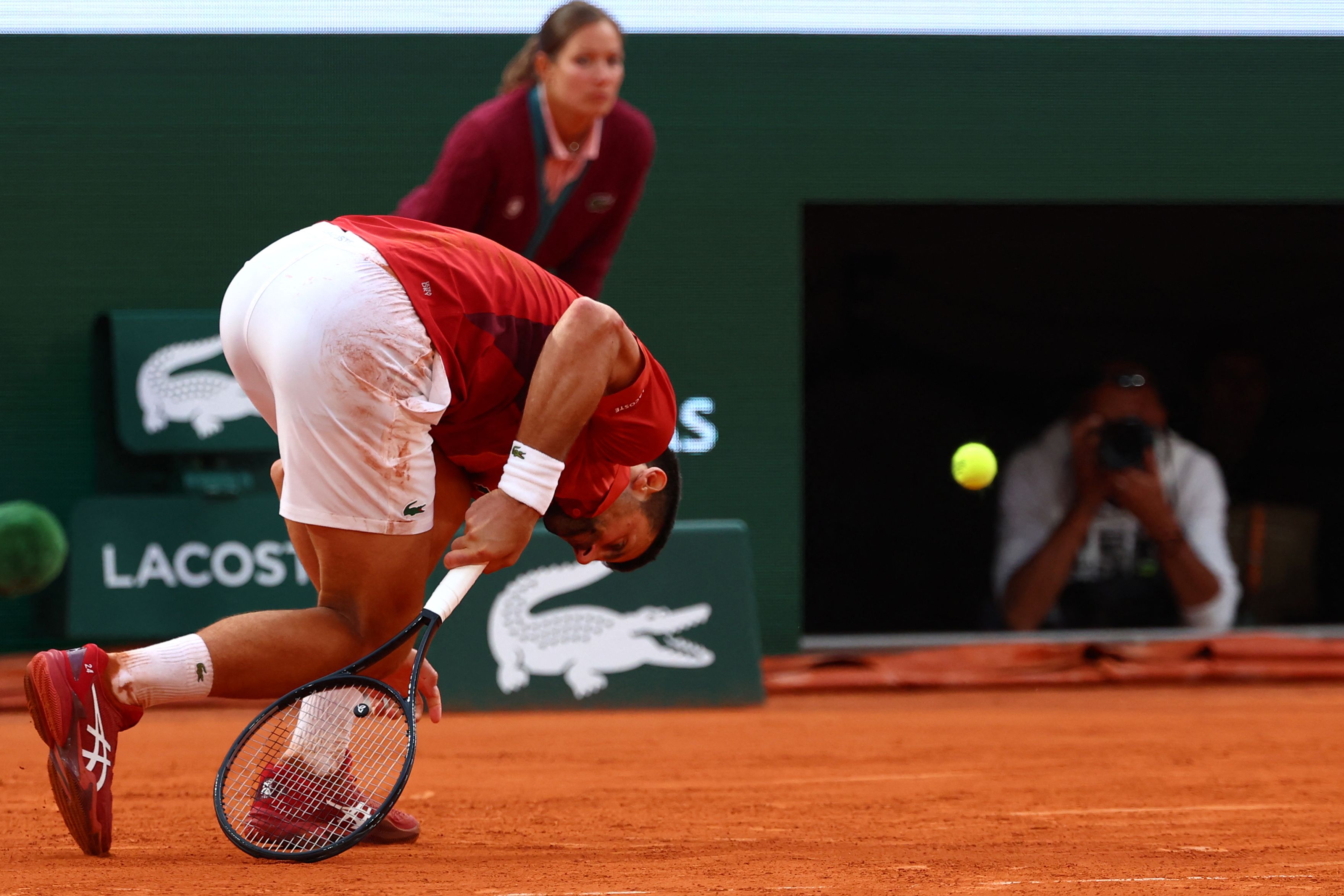 Serbia's Novak Djokovic falls on the court during his men's singles round of sixteen match against Argentina's Francisco Cerundolo on Court Philippe-Chatrier on day nine of the French Open tennis tournament at the Roland Garros Complex in Paris on June 3, 2024. (Photo by Emmanuel Dunand/AFP Photo)