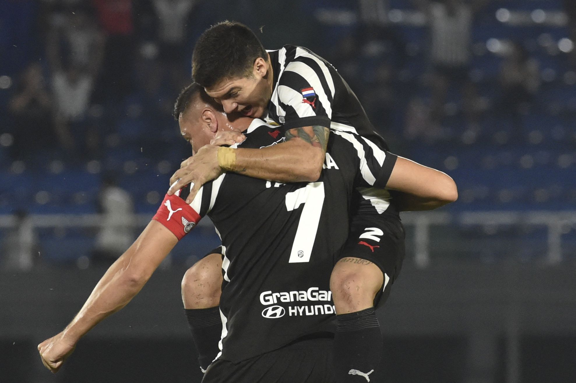 Libertad's forward Oscar Cardozo (L) celebrates with teammate defender Ivan Ramirez after scoring his team's second goal during the Paraguay First Division Apertura Tournament football match between Olimpia and Libertad at the Defensores del Chaco stadium in Asuncion on June 5, 2024. (Photo by Norberto Duarte/AFP Photo)