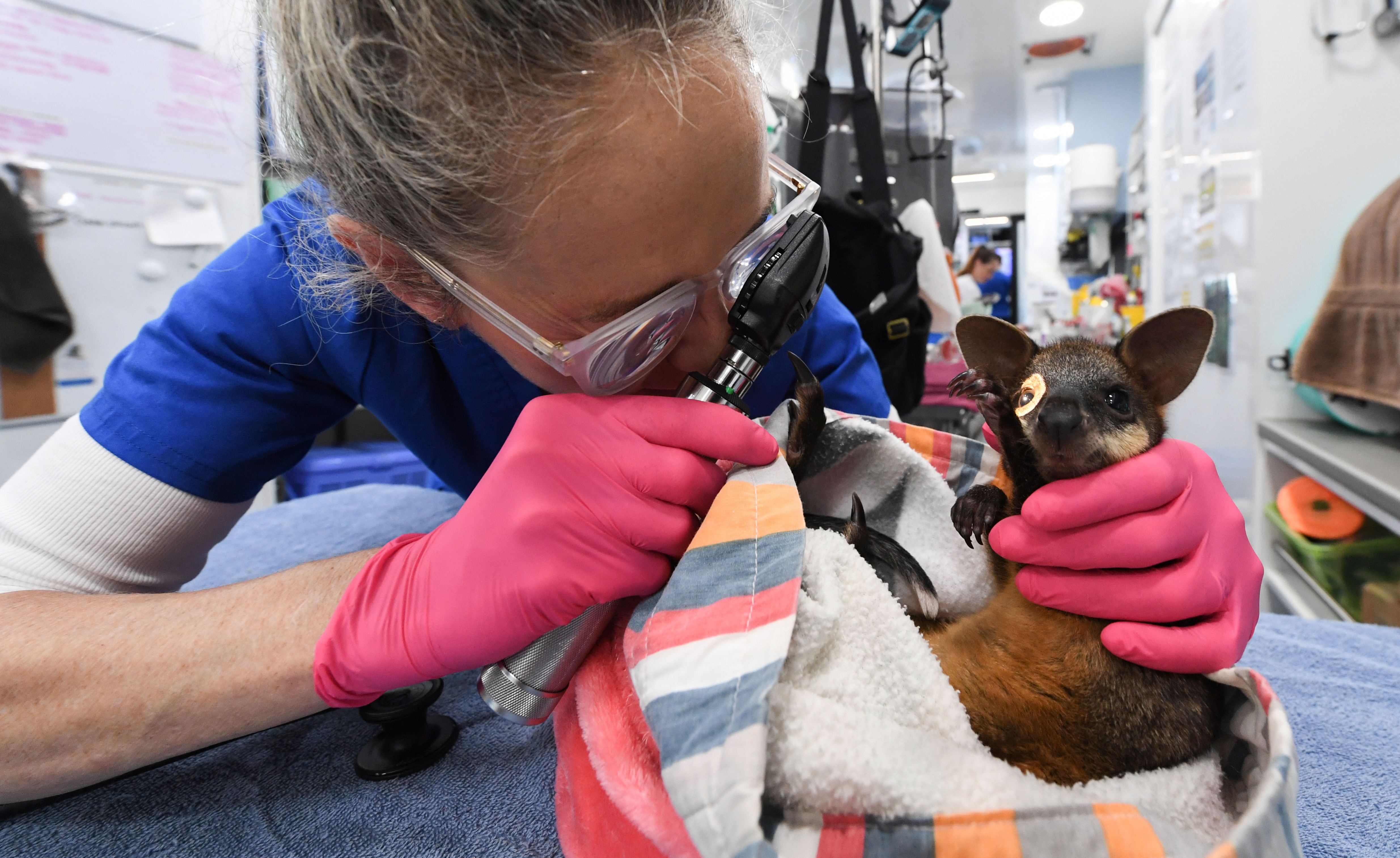 Dr Chantal Whitten checks on “Sprout”, a baby (joey) Swamp Wallaby whose mother was killed in a car accident where she survived by being thrown out of the pouch and onto the road on June 03, 2024 in Byron Bay, Australia. An all-species wildlife hospital reliant on donations and sponsorship is at risk of closure as a 70% increase in patients drives up costs. The Byron Bay Wildlife Hospital is the only multi-species wildlife hospital operating in the richly biodiverse north of the state of New South Wales in Australia. Opened in 2020, it operates 7 days a week and has treated almost 7000 sick, injured and orphaned native animals, including hundreds of threatened species patients. Custom-built inside a 22-wheel semi-trailer truck, the wildlife hospital can also be deployed to a natural disaster like a bushfire or flood to treat impacted wildlife. The registered charity's services are provided free of charge, and it receives no government funding. It is seeking tax-deductible donations and sponsorship to continue operating. (Photo by James D. Morgan/Getty Images)