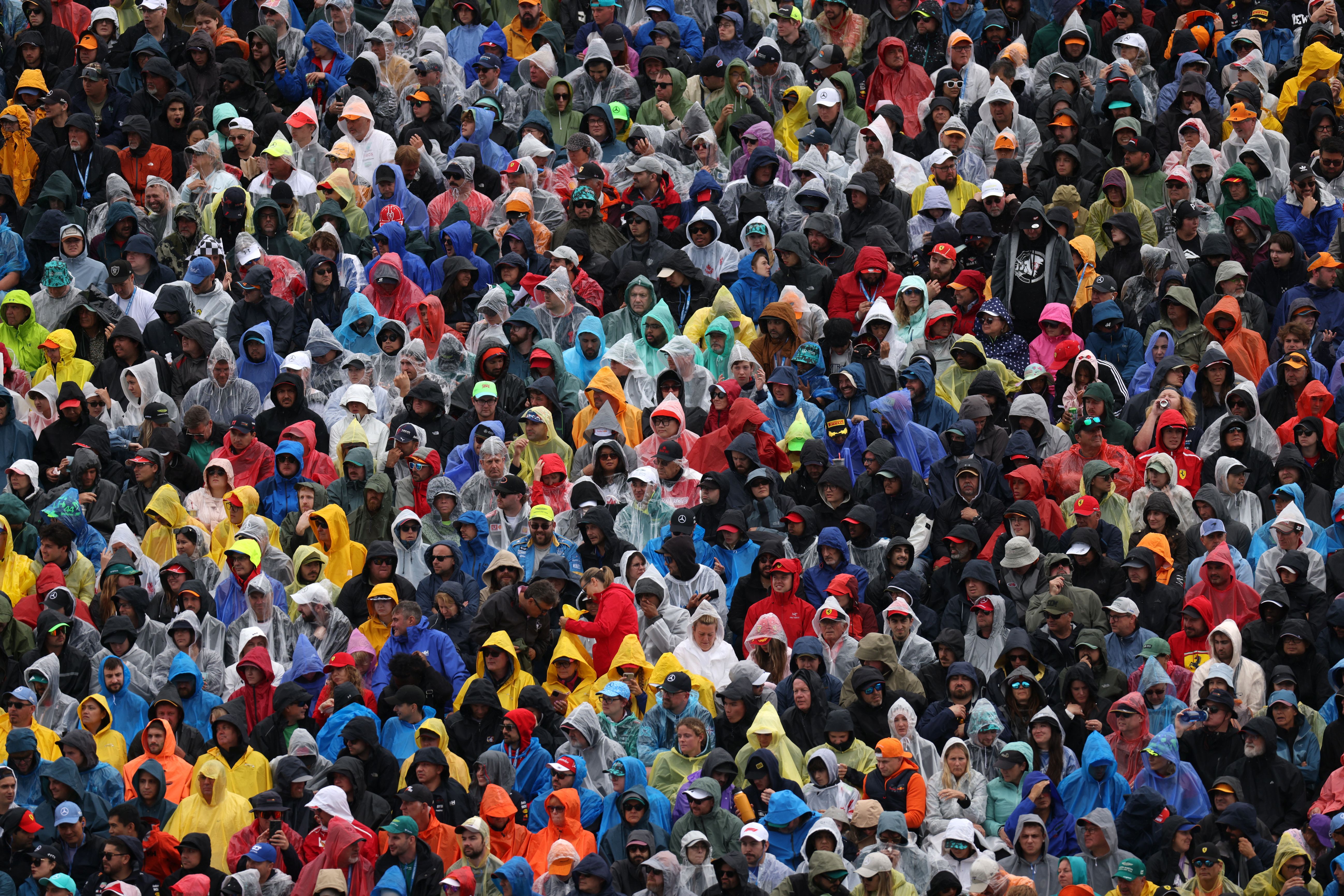 Fans in rain macs during the F1 Grand Prix of Canada at Circuit Gilles Villeneuve on June 09, 2024 in Montreal, Canada. (Photo by Andy Hone/LAT Images)
