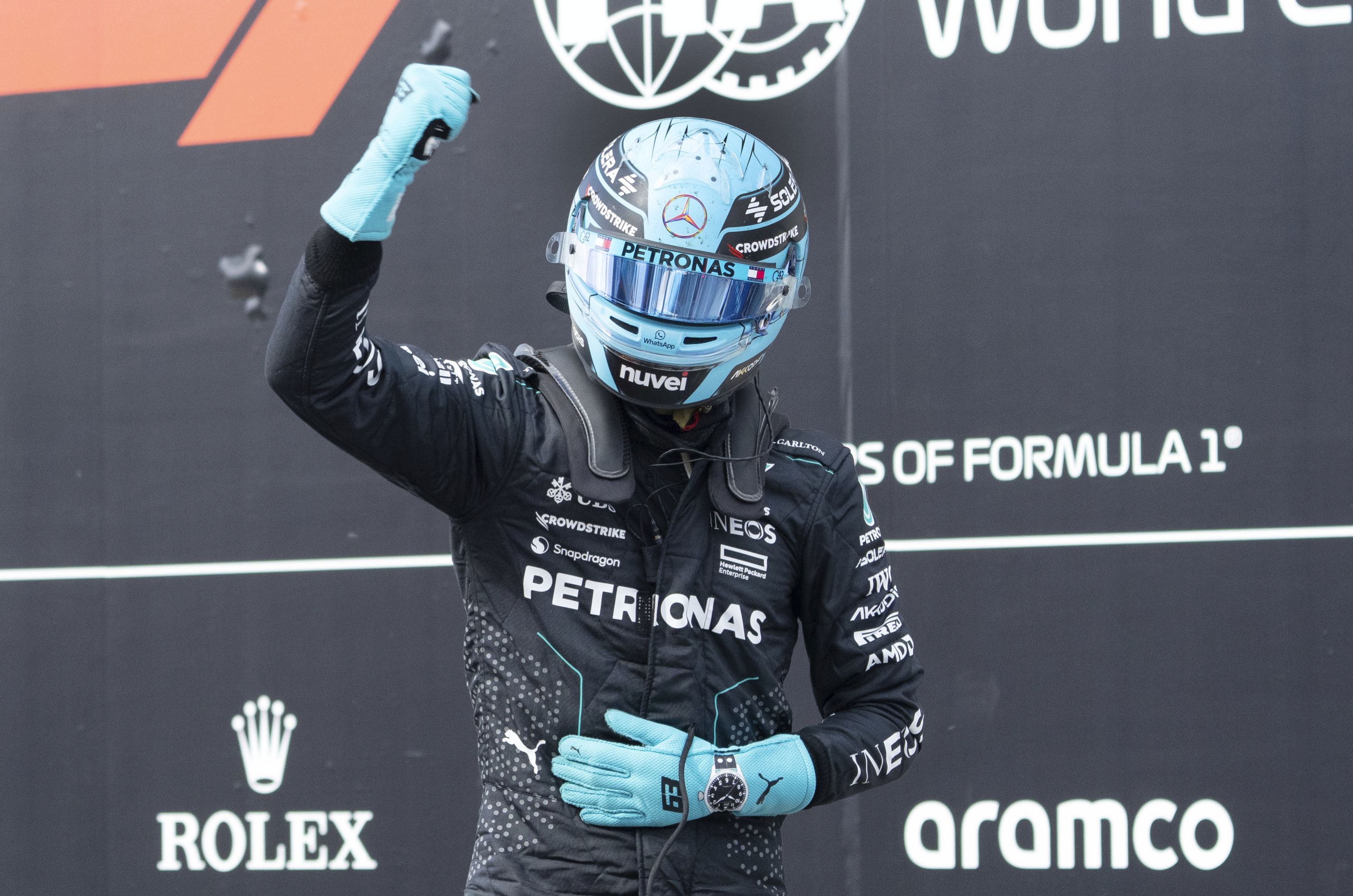 Mercedes driver George Russell, of Britain, celebrates after taking the pole in the qualifying session for the Formula 1 Canadian Grand Prix auto race Saturday, June 8, 2024, in Montreal. (Photo by Ryan Remiorz/The Canadian Press via AP Photo)