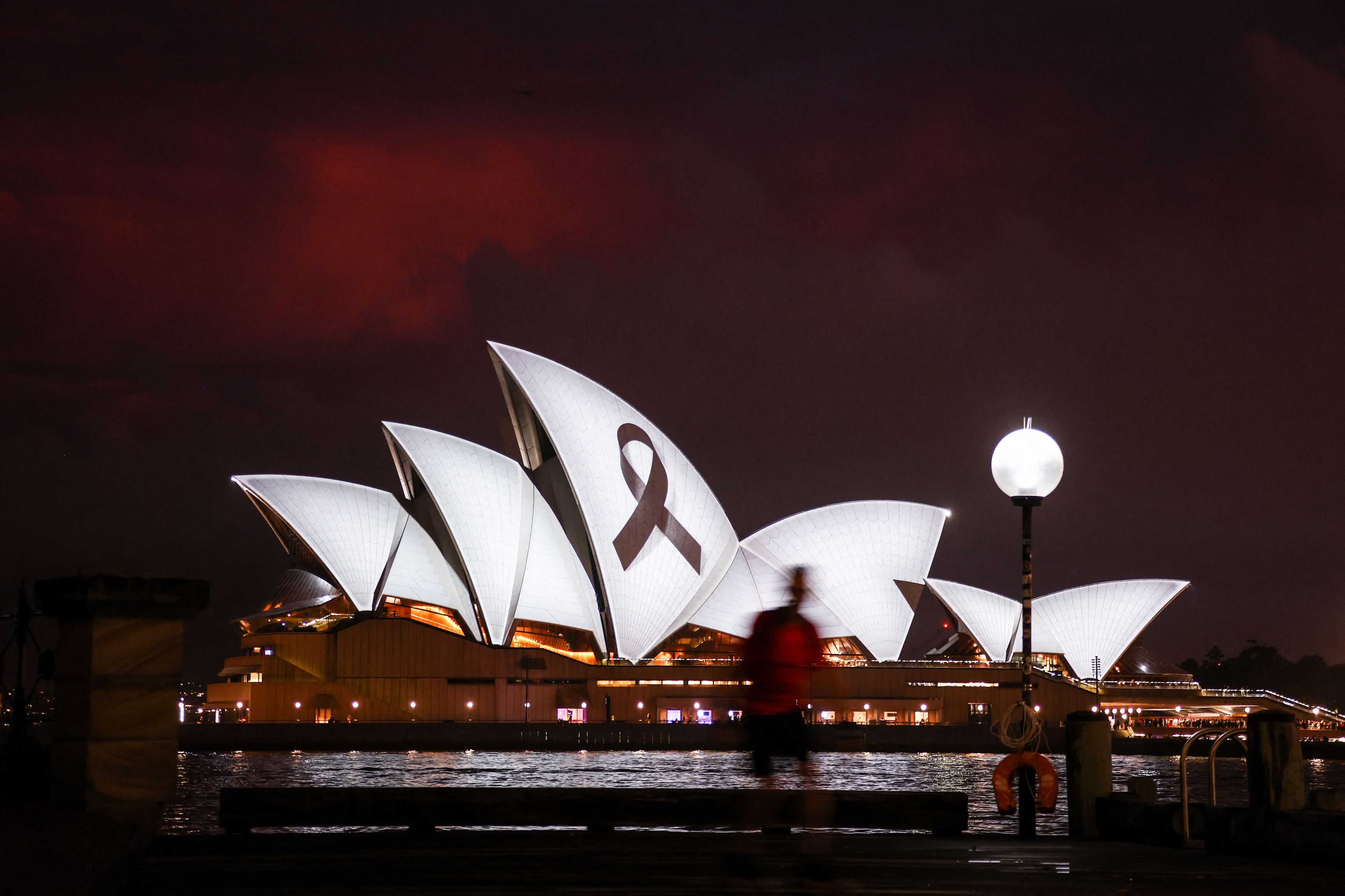 A black ribbon, symbolising remembrance and mourning, is projected onto the Sydney Opera House on February 9, 2023 in solidarity with Turkey and Syria after a massive earthquake devastated the two countries. (Photo by David Gray/AFP Photo)