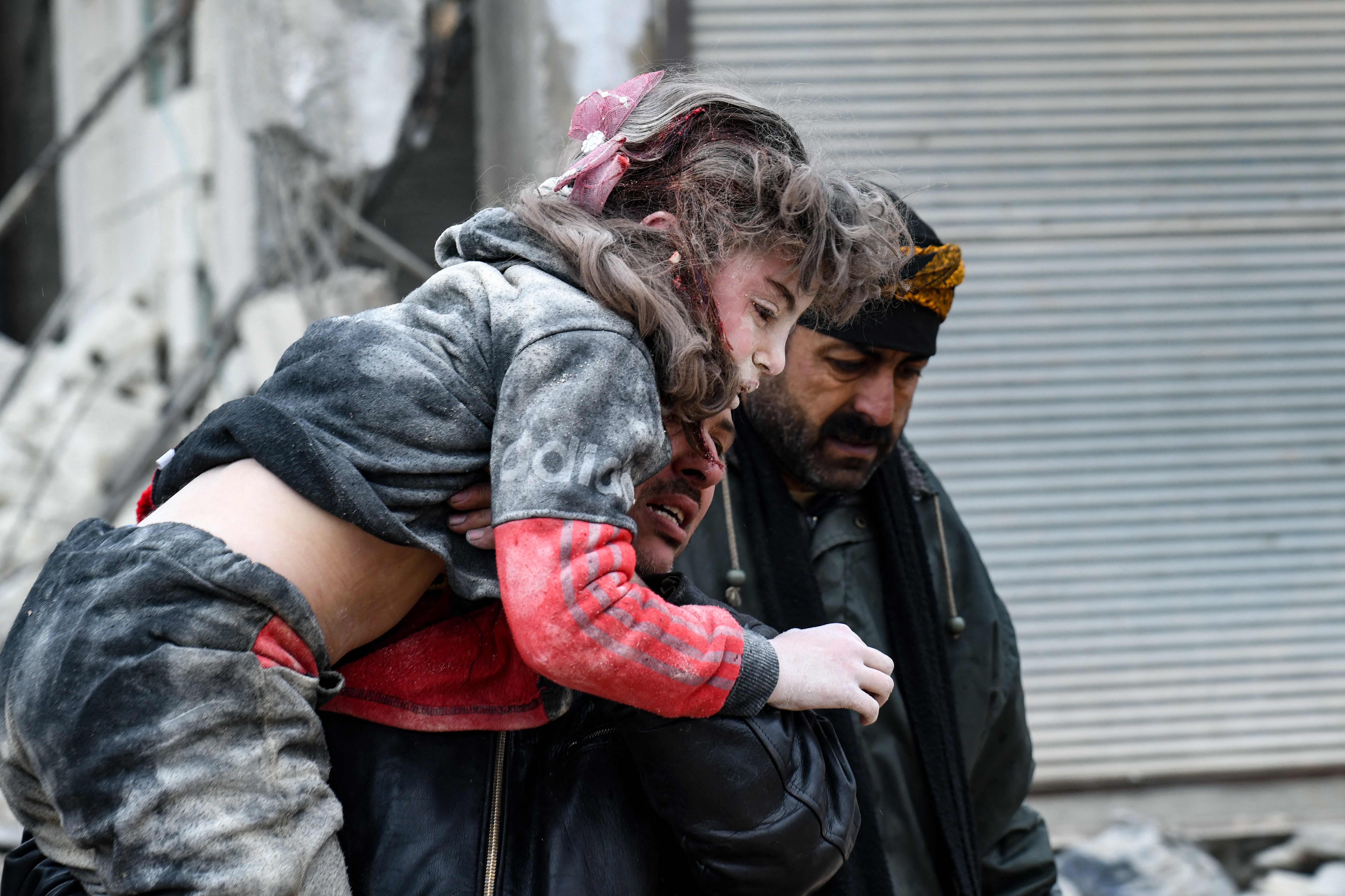 Residents carry an injured child from the rubble of a collapsed building following an earthquake in the town of Jandaris, in the countryside of Syria's northwestern city of Afrin in the rebel-held part of Aleppo province, on February 6, 2023. Hundreds have been reportedly killed in north Syria after a 7.8-magnitude earthquake that originated in Turkey and was felt across neighbouring countries. (Photo by Rami Al Sayed/AFP Photo)
