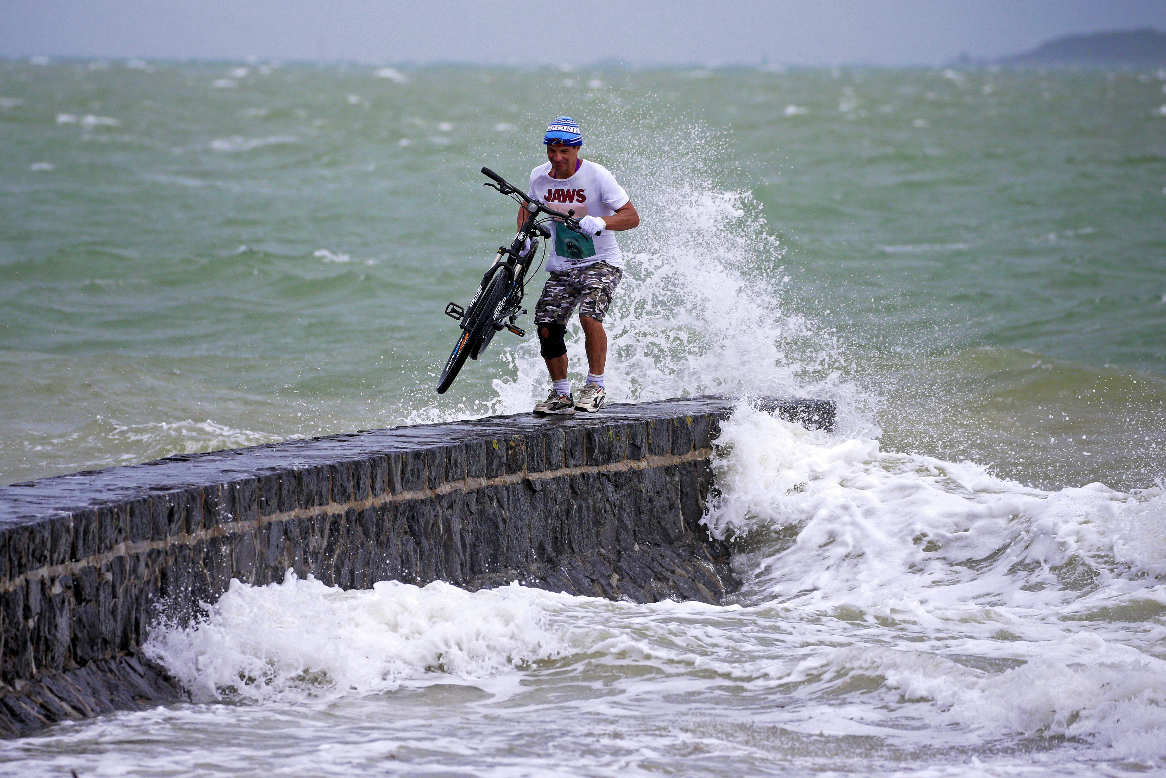 A man stands on breakwater with his bike along the waterfront in Auckland, New Zealand, Sunday, February 12, 2023. New Zealand's national carrier has canceled dozens of flights as Aucklanders brace for a deluge from Cyclone Gabrielle, two weeks after a record-breaking storm swamped the nation's largest city and killed several people. (Photo by Alex Burton/NZ Herald via AP Photo)