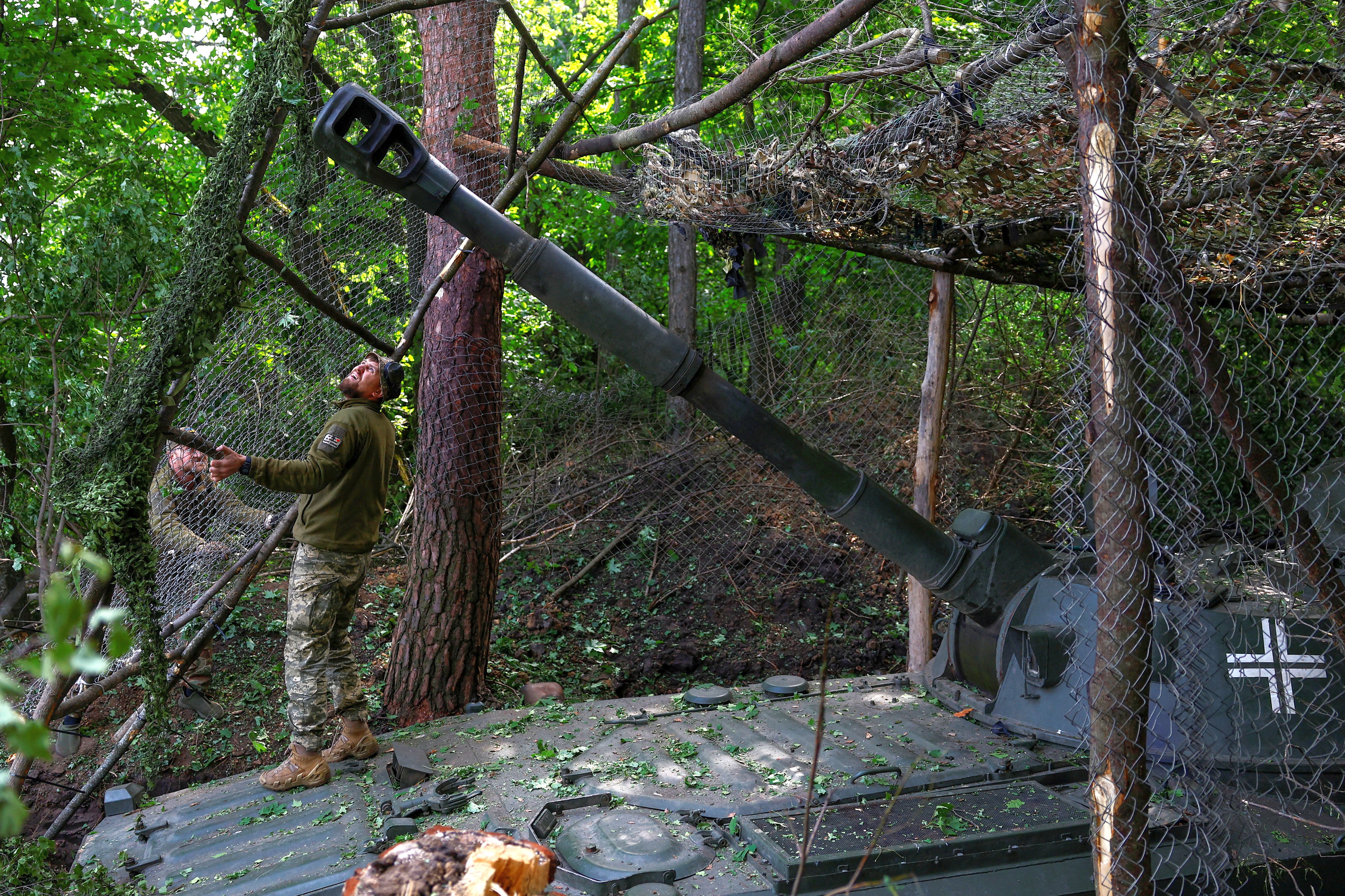 Ukrainian servicemen of the 42nd Separate Mechanized Brigade place steel wire net on a 2S1 Gvozdika self-propelled howitzer to protect it from Russian drones at a position in a front line, amid Russia's attack on Ukraine, in Kharkiv region, Ukraine on May 16, 2024. (Photo by Valentyn Ogirenko/Reuters)