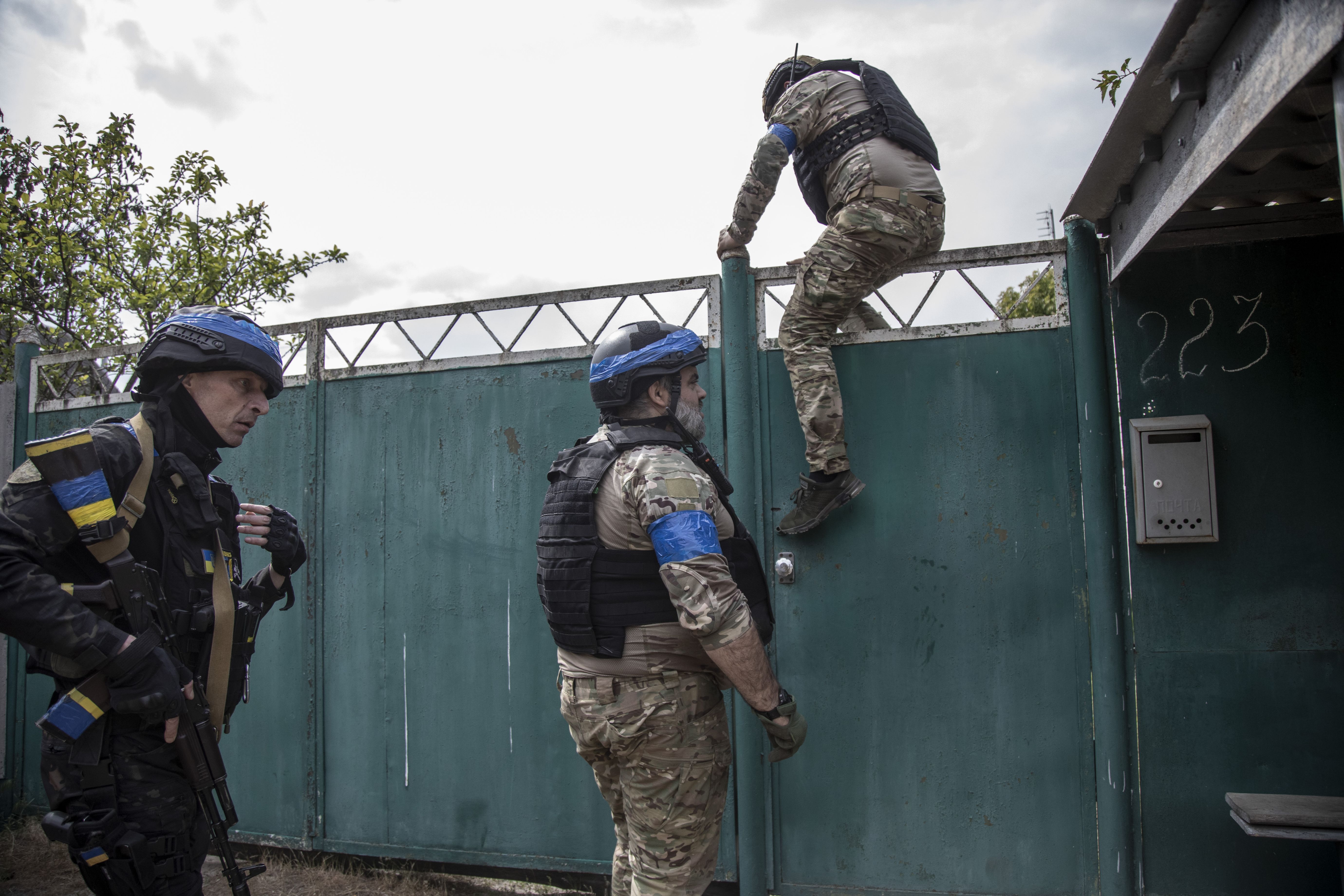 Police officers inspect a neighborhood for evacuation of civilians on a village nearby Vovchansk City as Russian military offensive advances on north of Kharkiv region, Kharkiv Oblast, Ukraine, May 19, 2024. (Photo by Narciso Contreras/Anadolu via Getty Images)