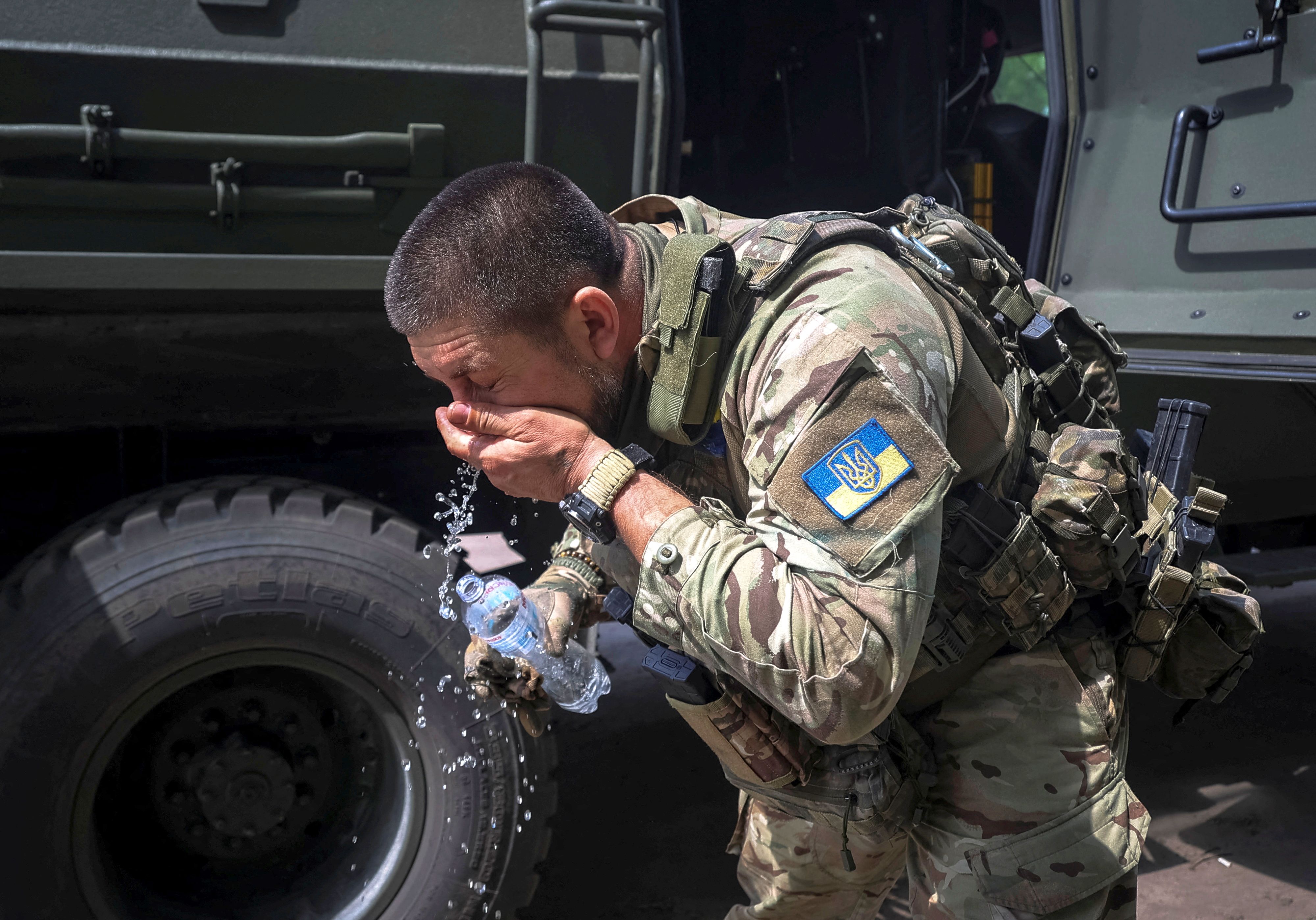 A Ukrainian serviceman washes his face after evacuating a wounded counterpart from the front line, near the town of Vovchansk in Kharkiv region, Ukraine, on May 12, 2024. (Photo by Vyacheslav Madiyevskyy/Reuters)