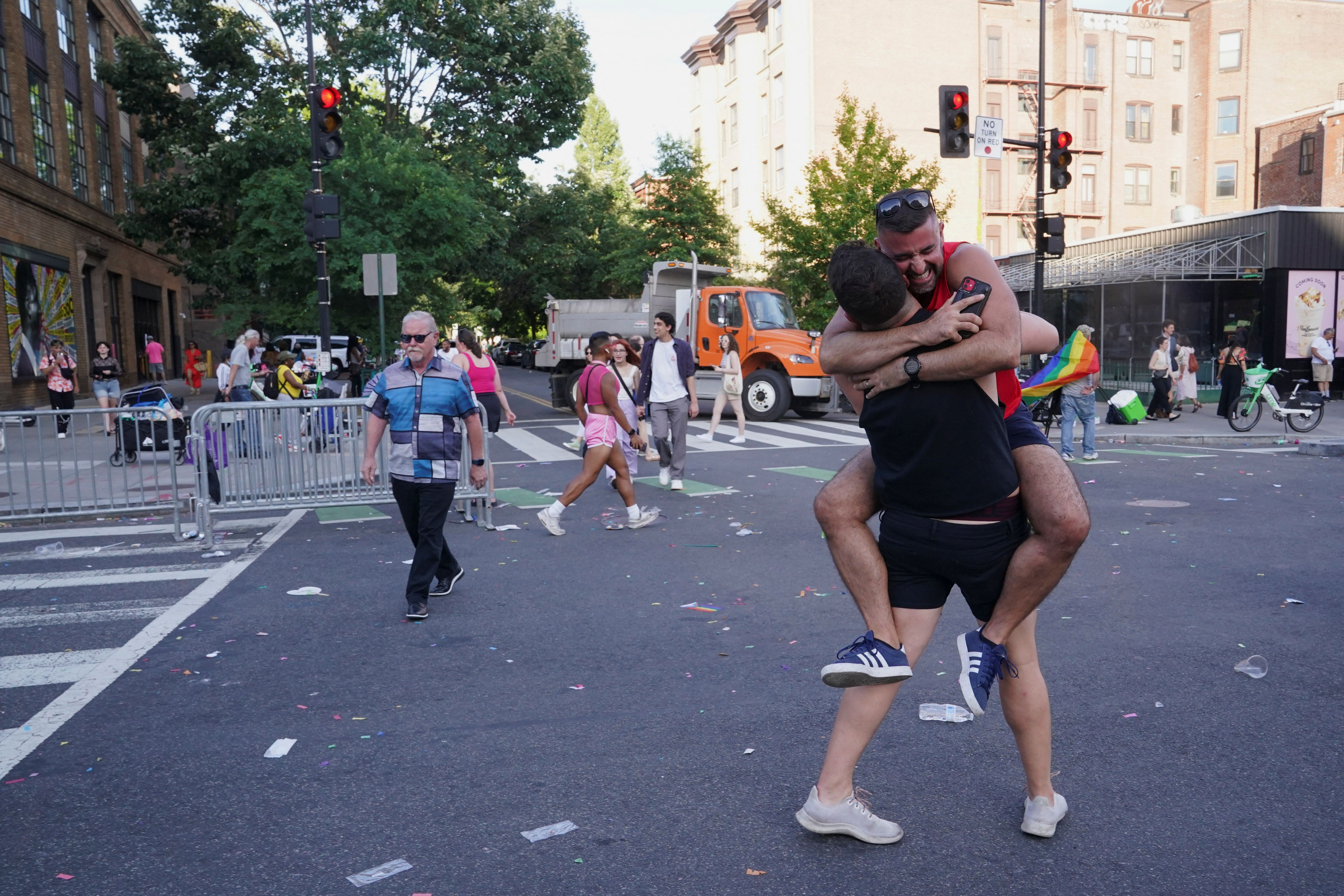 Matthew Crehan and Joey DeSanto Jones embrace after finding each other at the end of the annual LGBTQ+ Capital Pride parade in Washington on June 8, 2024. (Photo by Nathan Howard/Reuters)
