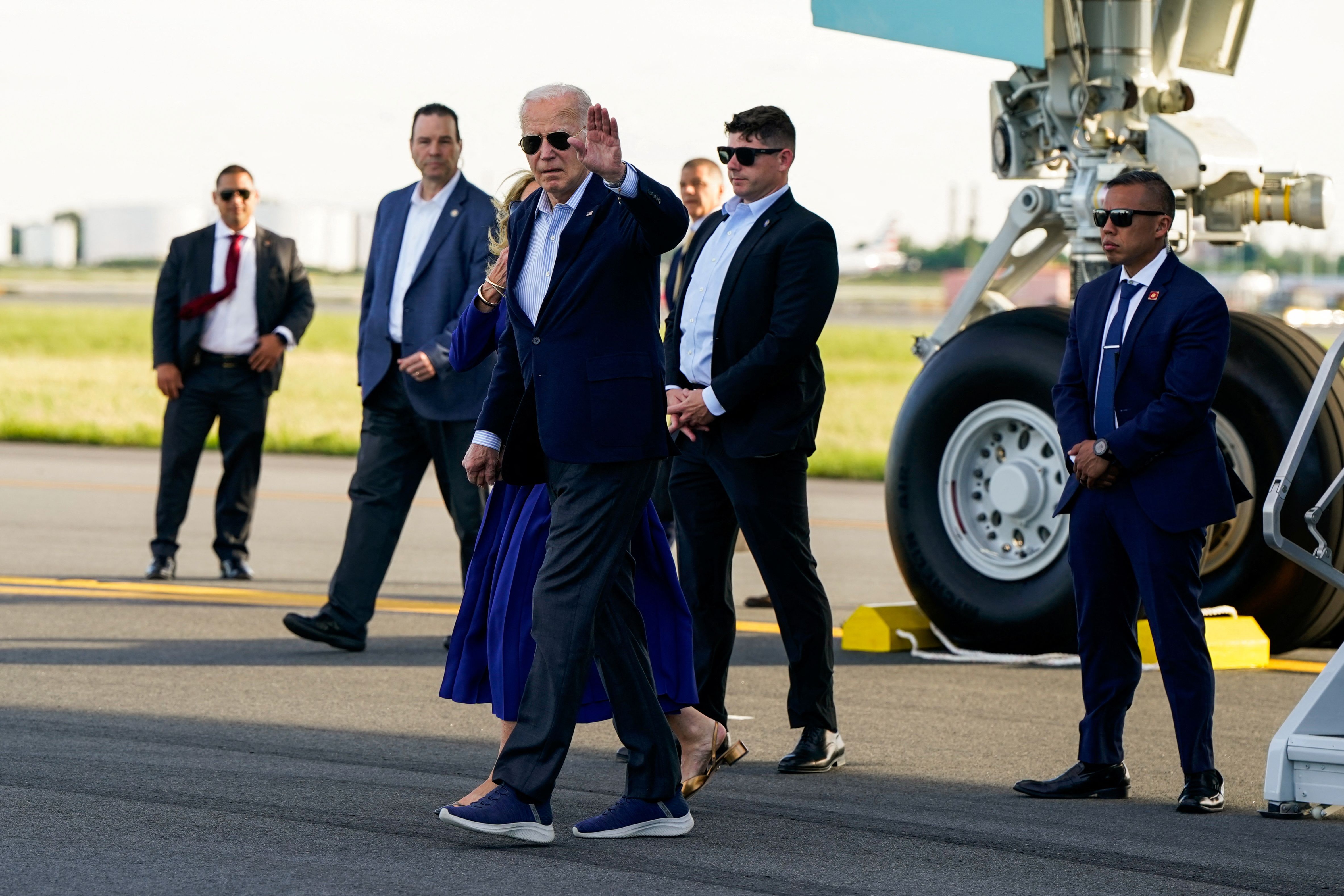 U.S. President Joe Biden and first lady Jill Biden step down from Air Force One at Philadelphia International Airport in Philadelphia, Pennsylvania on June 9, 2024. (Photo by Elizabeth Frantz/Reuters)
