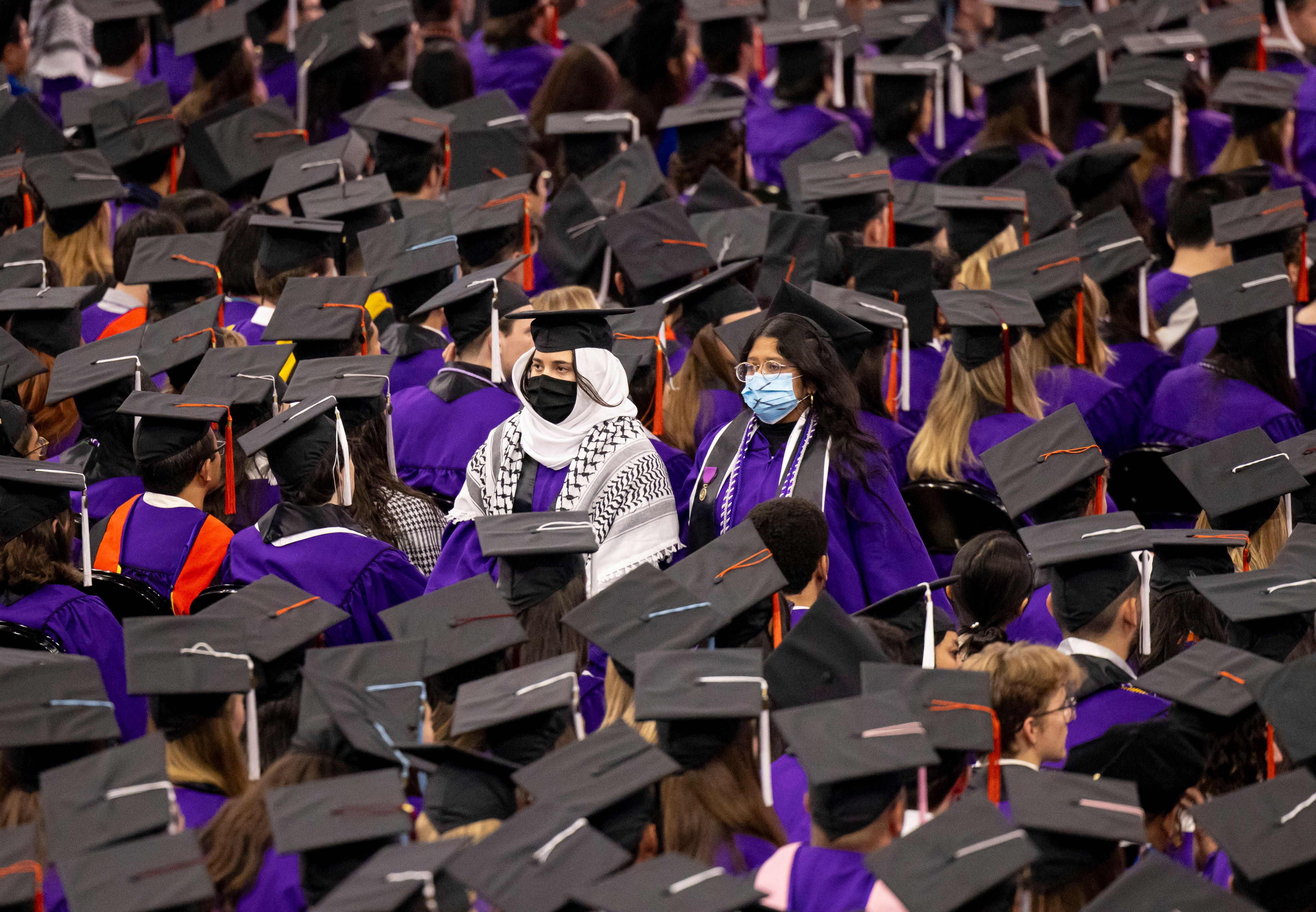 A couple of graduates silently walk out in support of Palestinians during Northwestern University's commencement, Sunday, June 9, 2024, at the United Center, in Chicago. (Photo by Brian Cassella/Chicago Tribune via AP Photo)