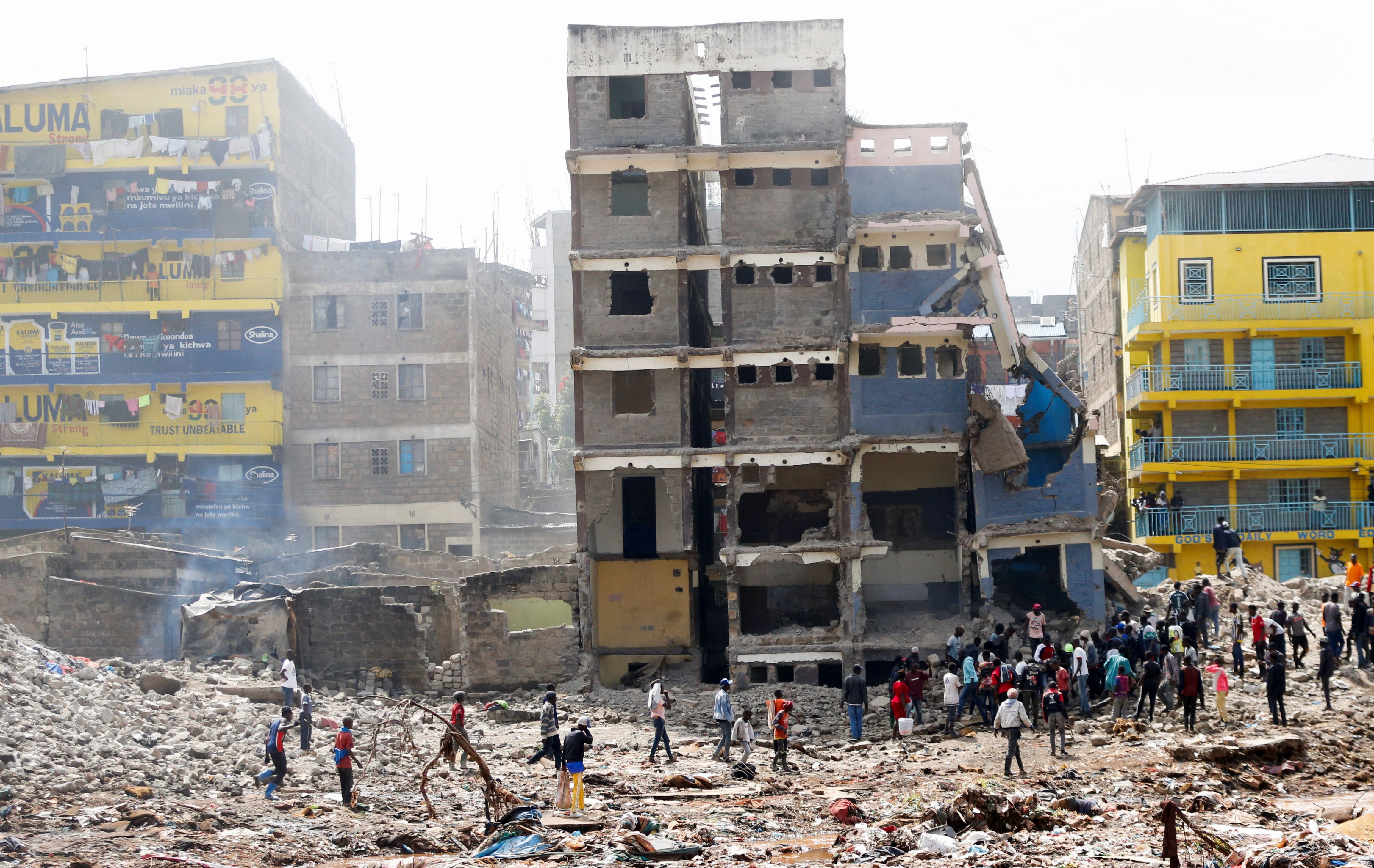 Scavengers of scrap metal gather to search for their colleague under the rubble of a residential flat built on riparian land, that collapsed while undergoing demolition near the Mathare River, during World Environment Day under the theme of land restoration, desertification and drought resilience in Huruma District of Nairobi, Kenya on June 5, 2024. (Photo by Thomas Mukoya/Reuters)