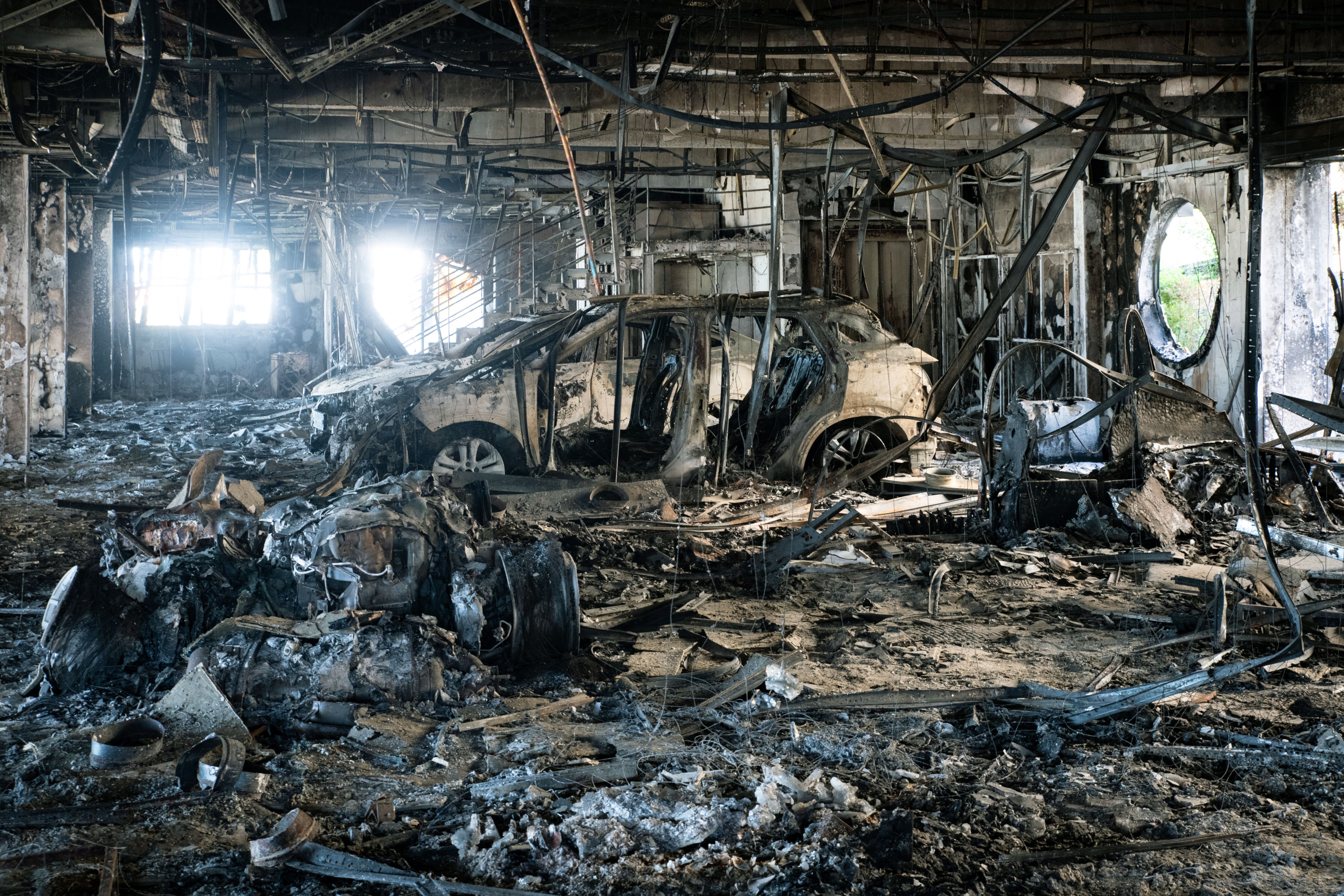 This photograph shows fire-damaged vehicle inside the Sodauto car dealership in Magenta, suburbs Vallee des Colons, in France's Pacific territory of New Caledonia in Noumea on June 7, 2024, more than two weeks after deadly riots broke out in the Pacific territory. (Photo by Delphine Mayeur/AFP Photo)
