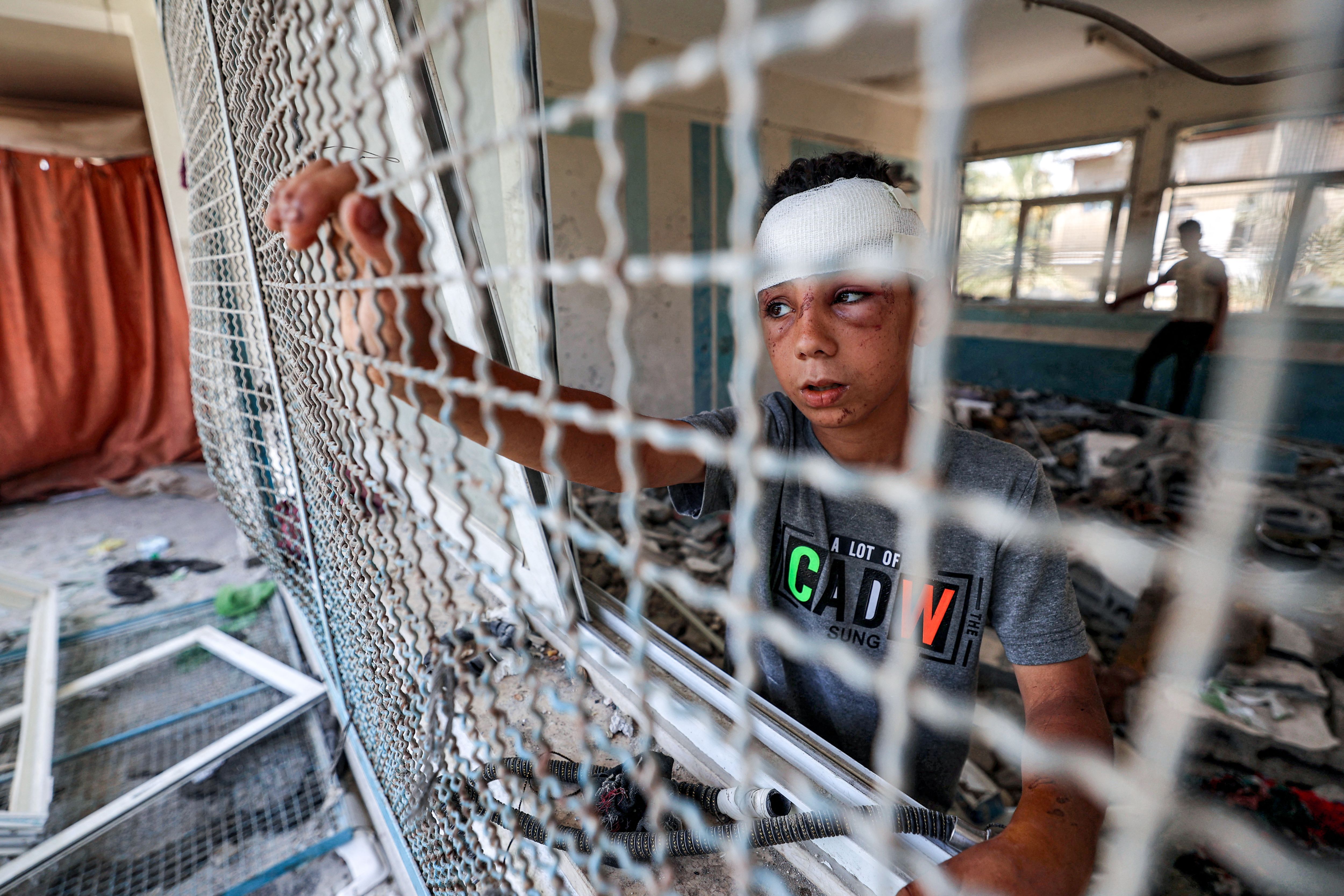 An injured boy stands by a window lattice in a destroyed classroom where people were sheltering at a school run by the UN Relief and Works Agency for Palestine Refugees (UNRWA) that was previously hit by Israeli bombardment, in the Nuseirat camp in the central Gaza Strip on June 7, 2024 amid the ongoing conflict in the Palestinian territory between Israel and Hamas. (Photo by Eyad Baba/AFP Photo)