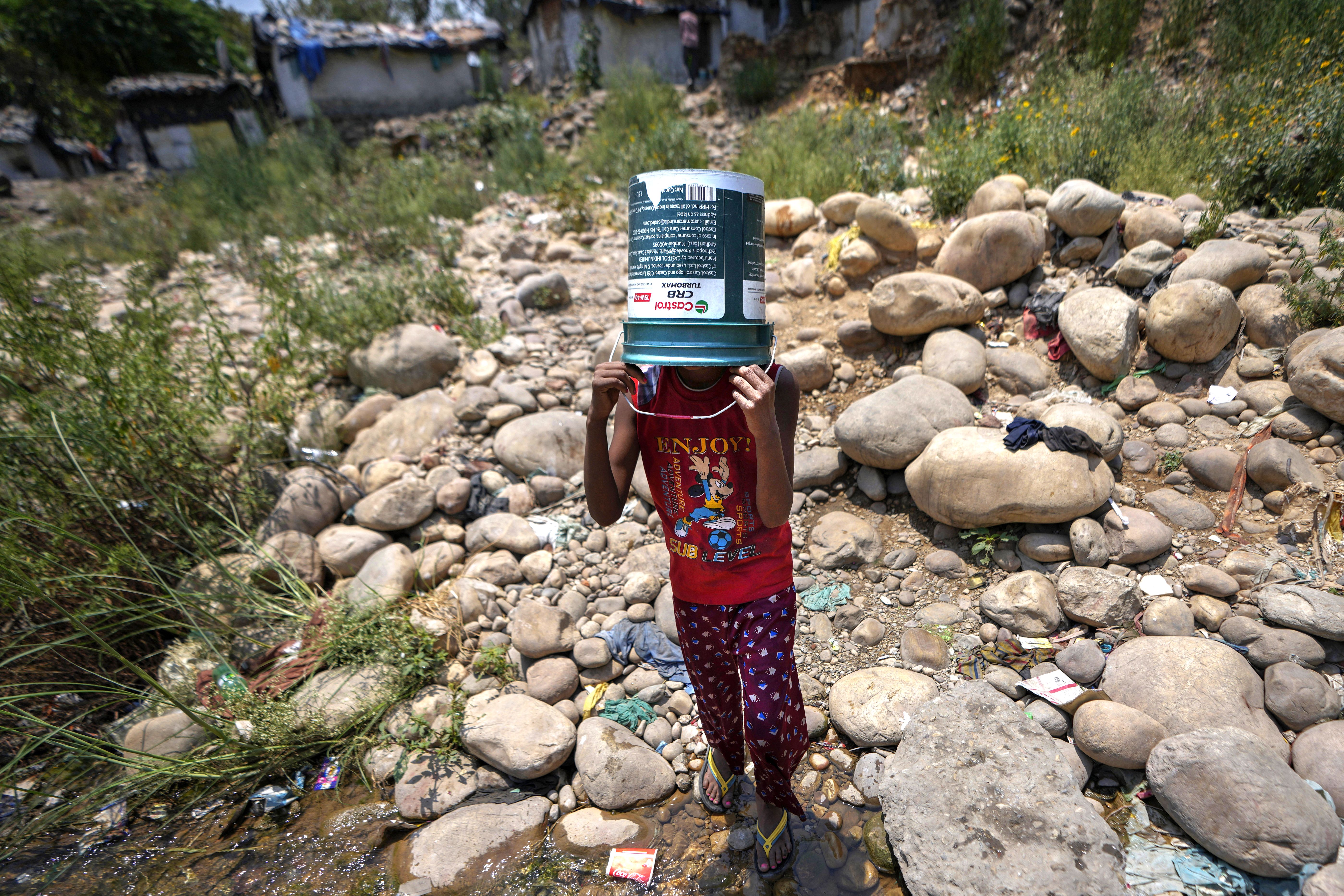 A girl covers her head with a repurposed engine oil container to shield herself from the sun as she walks to collect water from a leaking municipal pipe on a hot summer day on the outskirts of Jammu, India, Friday, May 31, 2024. Officials say a scorching heat wave has killed at least 14 people, including 10 election officials, in eastern India with temperatures soaring up to 49.9 degrees Celsius (122 degrees Fahrenheit) in parts of India this week. (Photo by Channi Anand/AP Photo)