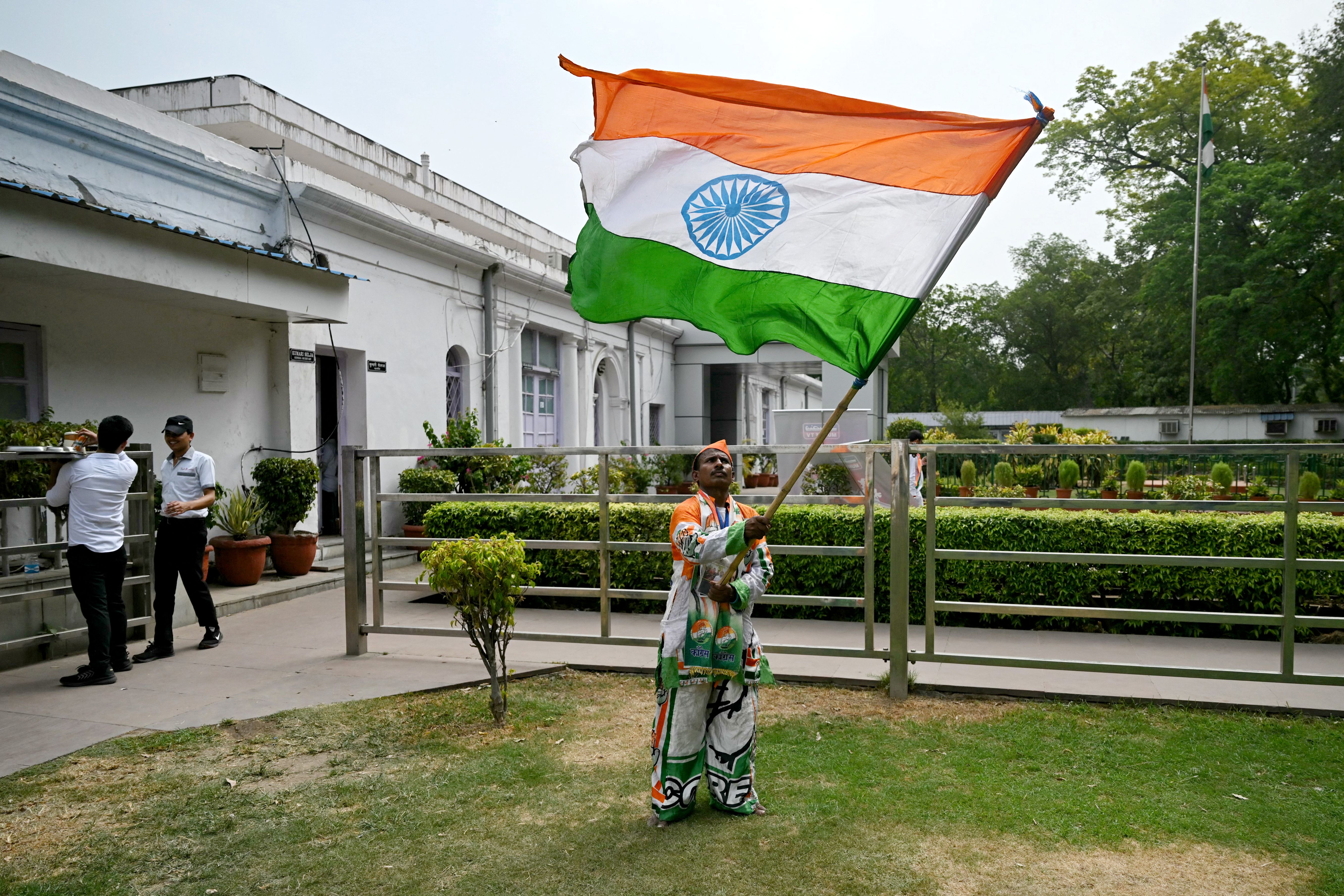 A supporter (R) of Indian National Congress (INC) party waves India's national flag after counting of votes began for India's general election, at the INC headquarter in New Delhi on June 4, 2024. Vote counting began in India's election on June 4, with Prime Minister Narendra Modi all but assured a triumph for his Hindu nationalist drive that has thrown the opposition into disarray and deepened concerns for minority rights. (Photo by Arun Sankar/AFP Photo)