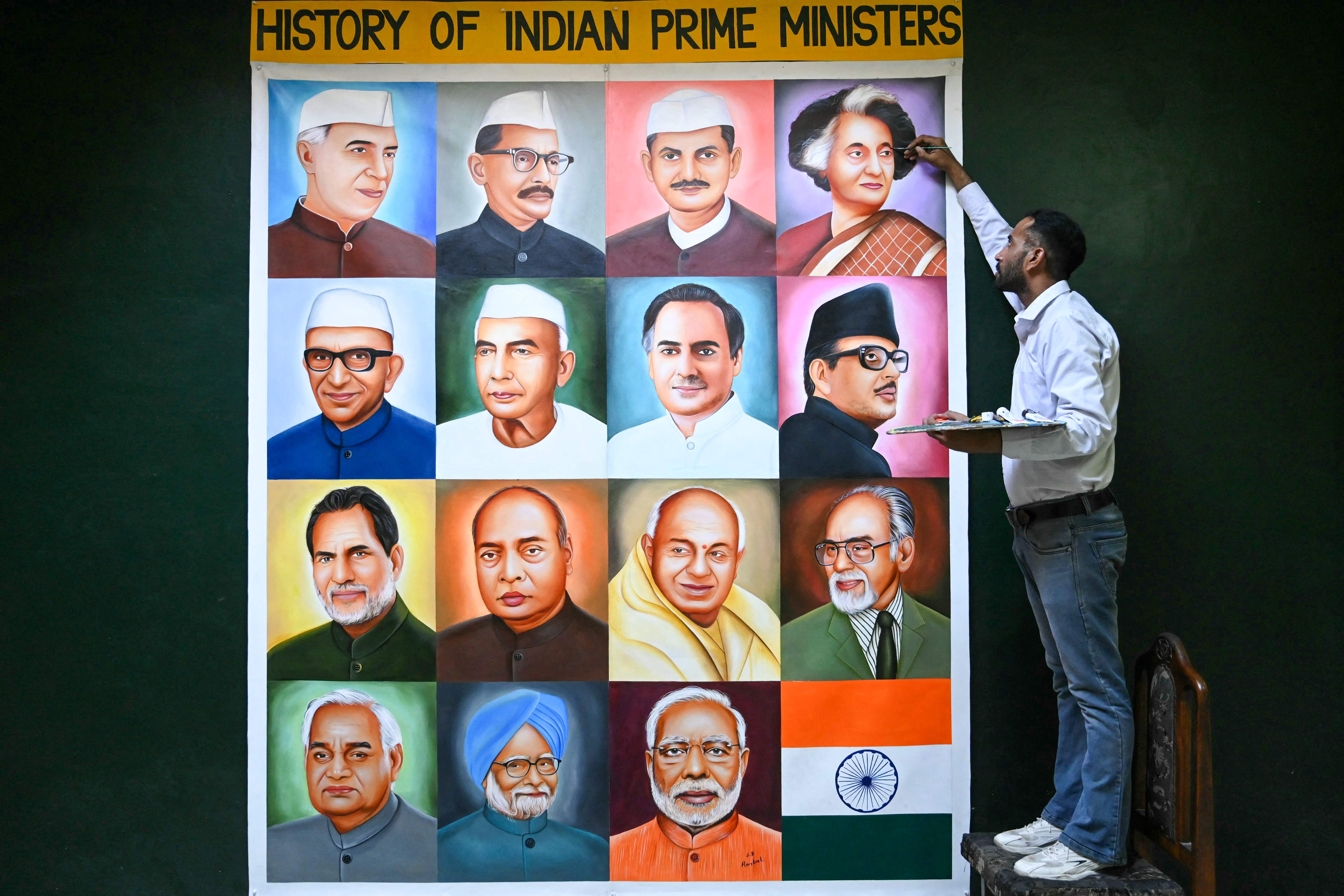 An artist paints portraits of Indian prime ministers at his workshop in Amritsar on June 7, 2024. (Photo by Narinder Nanu/AFP Photo)